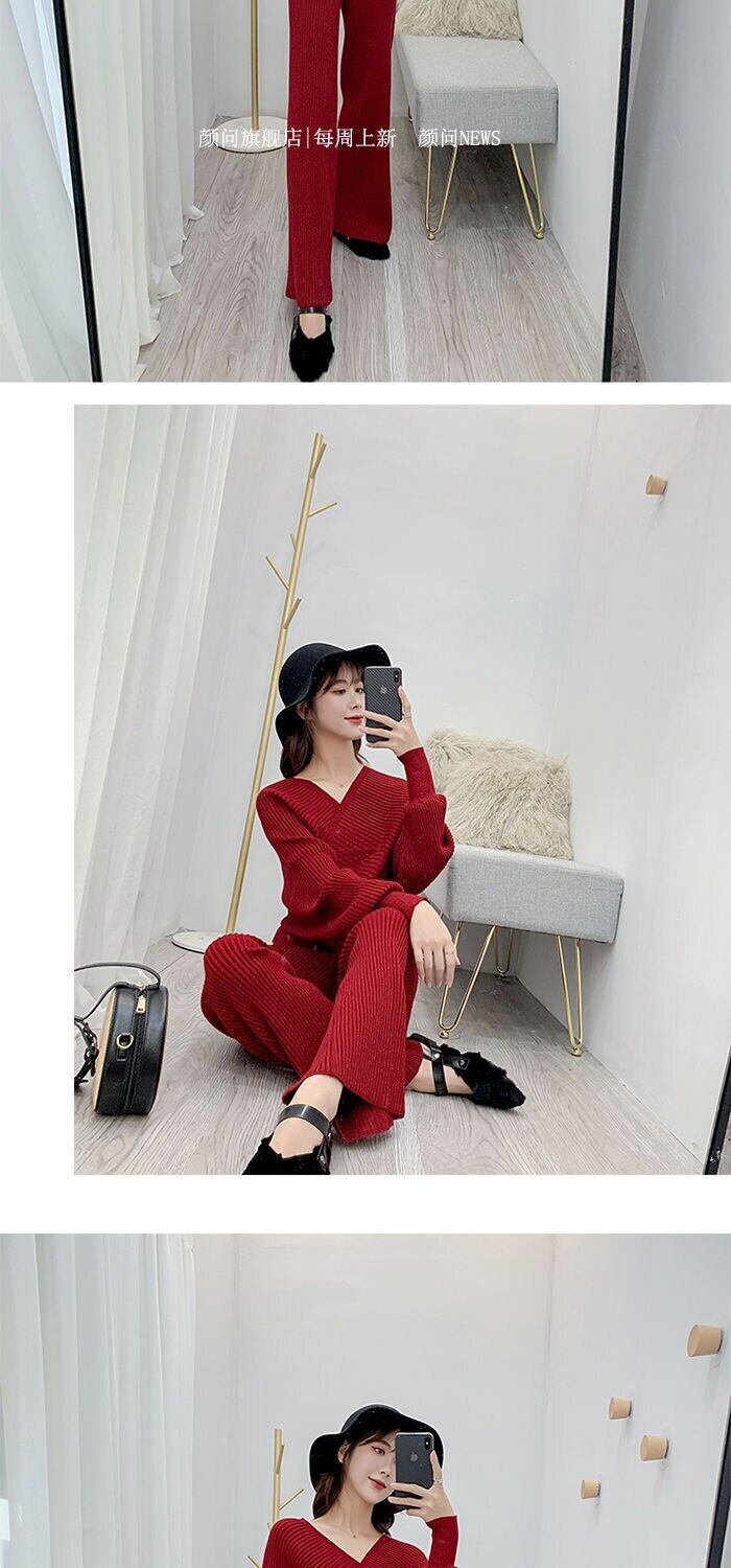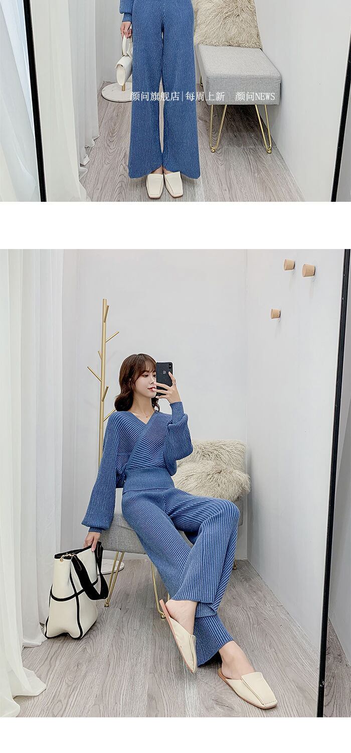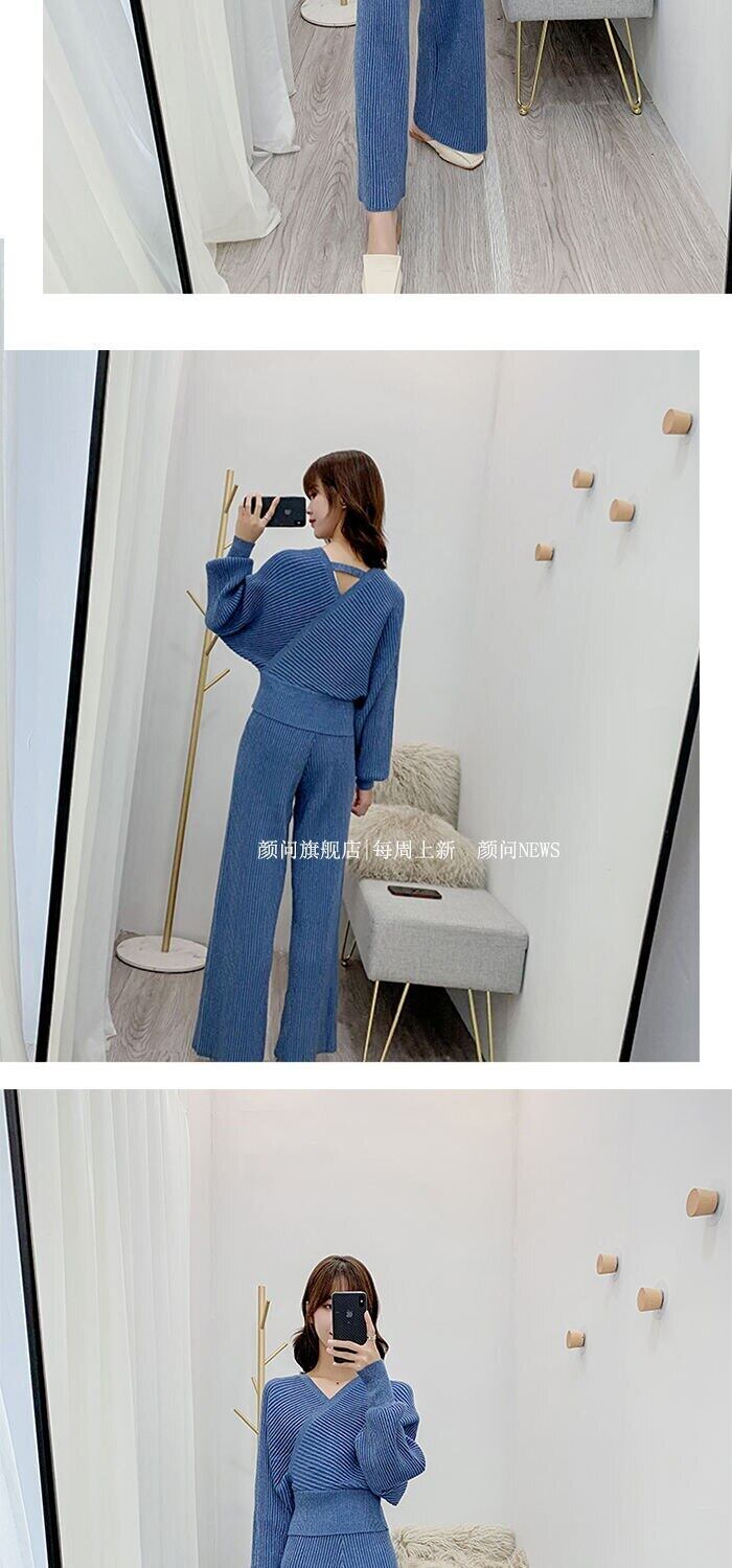 女性春秋ニット 2 点セット V ネックランタンスリーブプルオーバートップ + ワイドレッグパンツオフィスレディスーツ スプリング 春物 オータム 秋物 Vネック ワイドパンツ 会社 学校 通勤や通学にも bel71588540990 | aliel