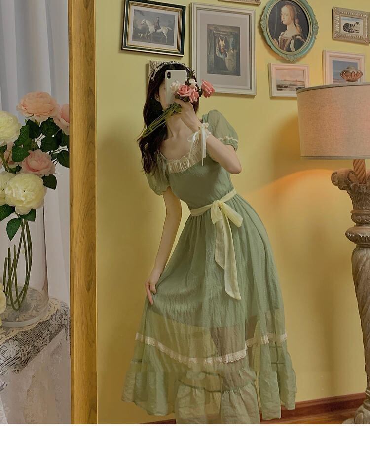 レトロサマーワンピース レディース パフスリーブ Vネック ウエスト甘めフリル ロングワンピース グリーン 大人ガーリー スウィート キュート カジュアル 夏物 bel25722803119