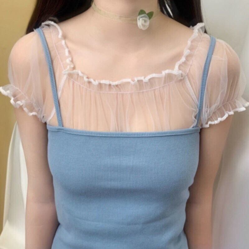 夏の女性スウィートロリータスタイルブラウススラッシュネックフリルメッシュシャツセクシーなかわいいショートパフスリーブ ラッフル 大人ガーリー キュート カジュアル サマー 夏物 bel11487152854 | aliel