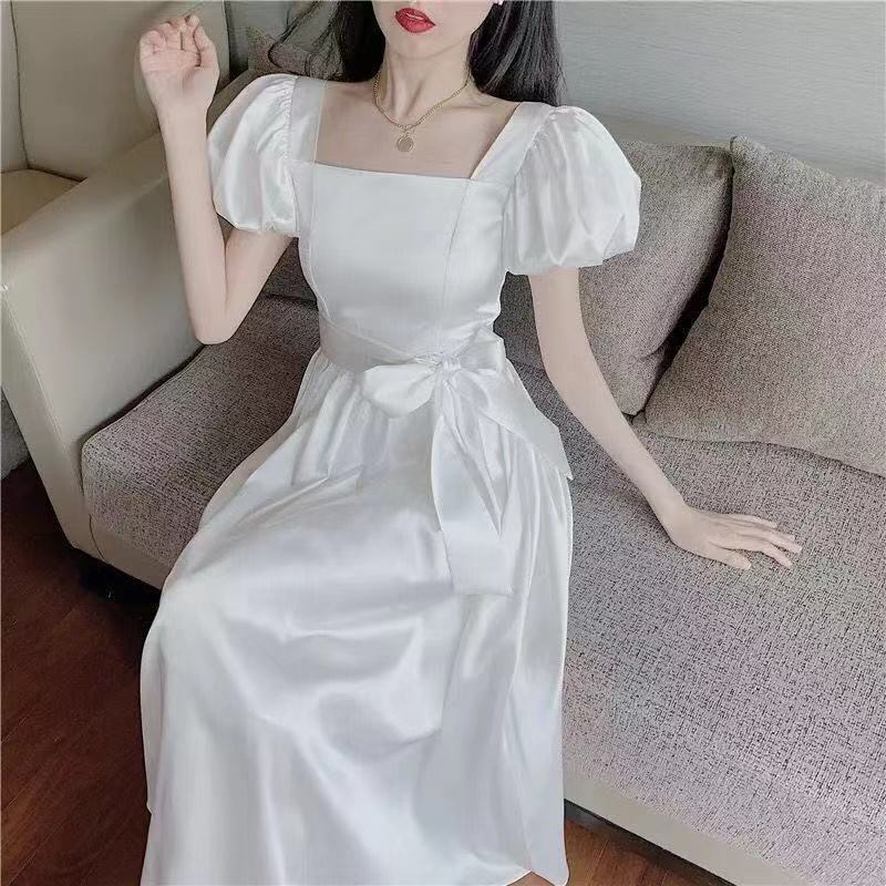 女性の夏の白いパフ スリーブ ホリデー ドレス レディース スクエア カラー サッシュ ドレス A ライン Vestidos ホワイト サマー 夏物 Aライン スクウェア bel98471877999 | aliel