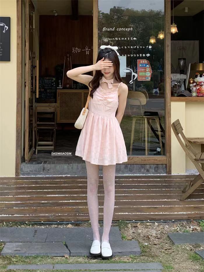 女性フリルフラウンスミニドレススリムフィットかわいいドレス 2022 夏シフォンピンクの弓甘いストラップドレス リボン 大人ガーリー スウィート キュート カジュアル サマー 夏物 bel40611687864 | aliel