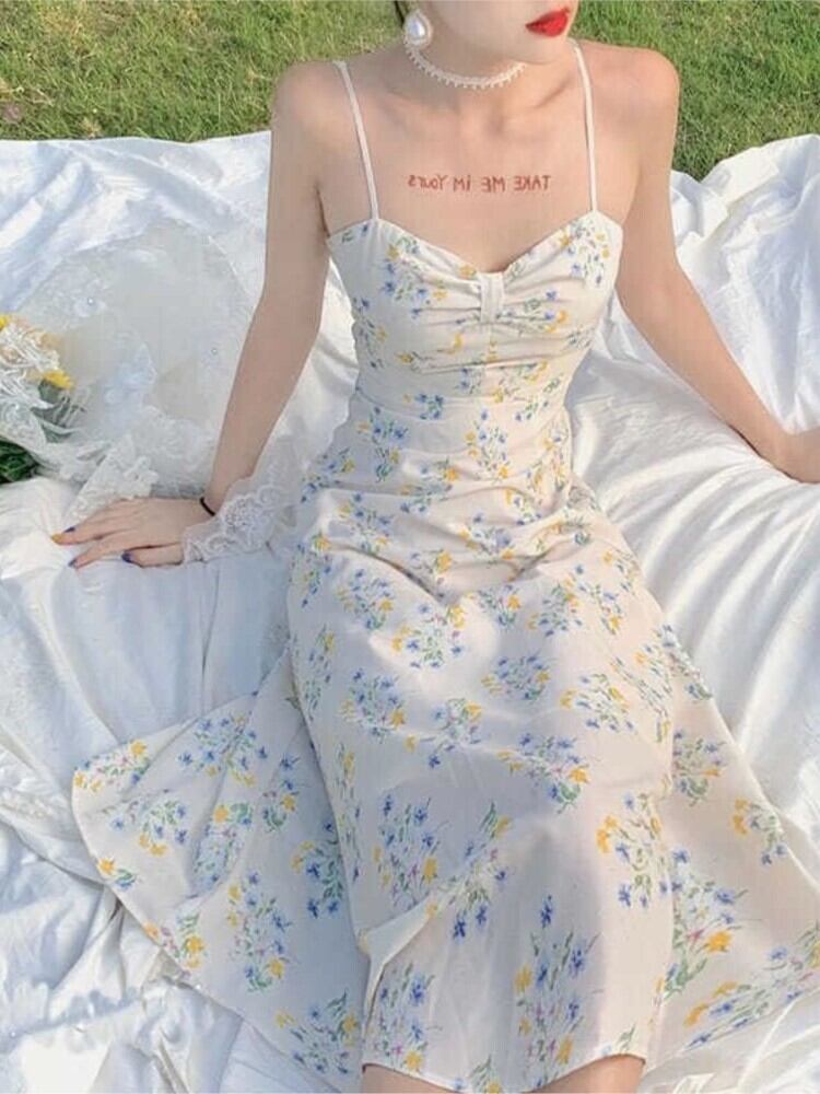 フランスのレトロなVネックストラップホワイトフローラルプリントシフォンドレスWomem甘いミディドレスフリルロングドレス2021 ラッフル 大人ガーリー スウィート キュート カジュアル 花柄 bel9438333424 | aliel