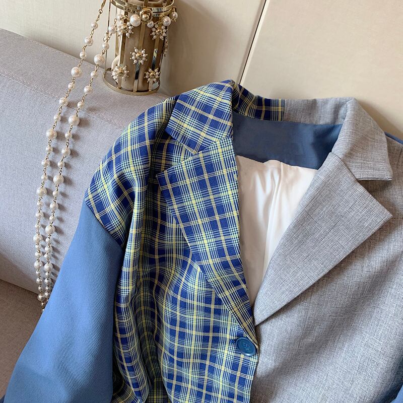 女性ブレザースーツジャケットパッチワークチェック柄ルーズフライドストリート全試合ジャケット春秋 голубое пальто スプリング 春物 オータム 秋物 bel62801442654 | aliel