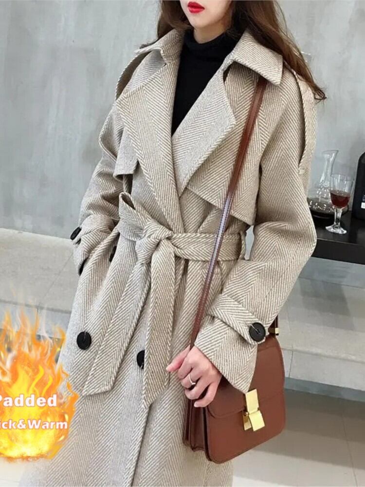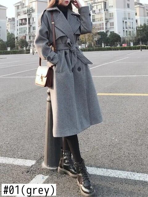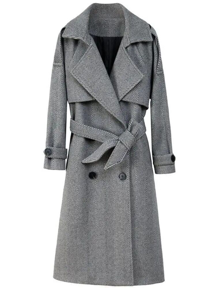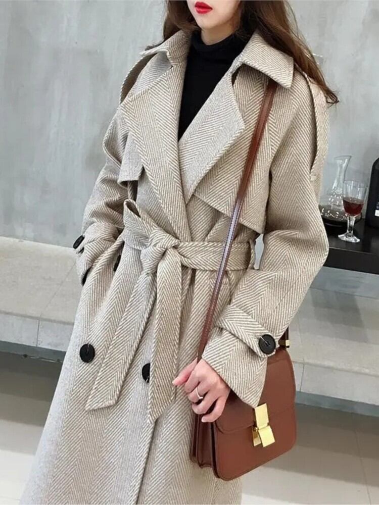2022 女性のエレガントな長袖オーバーコート女性の格子縞のダブルブレストウールのコートとベルトオフィスレディロングコート ハーネス 会社 学校 通勤や通学にも bel29479722289 | aliel