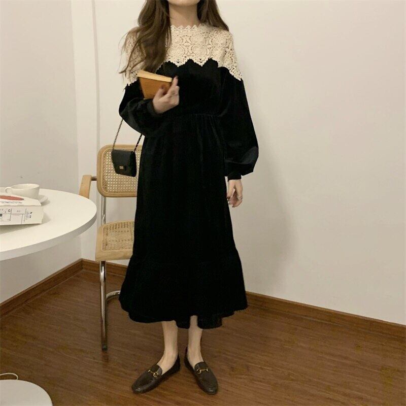 パッチワークパフスリーブ秋冬ロングドレス女性のレースのベルベットドレスハーフタートルネック 2021 イン Vestidos オータム 秋物 ウィンター 冬物 bel36788794850 | aliel
