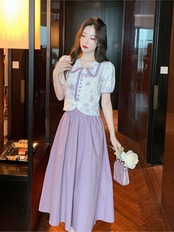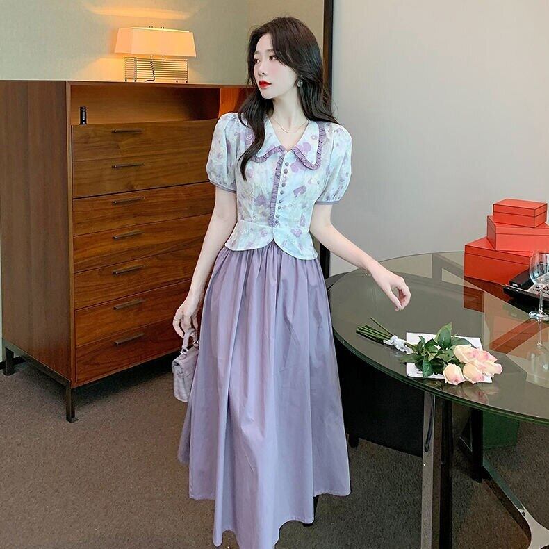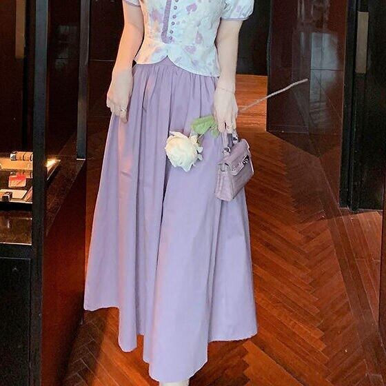 フランスのレトロな夏の甘いかわいい紫セット プリント花柄ブラウス + ウエスト ミディ スカート 2 ピース スーツ ストリート セット 大人ガーリー スウィート キュート カジュアル サマー 夏物 bel60021182689 | aliel