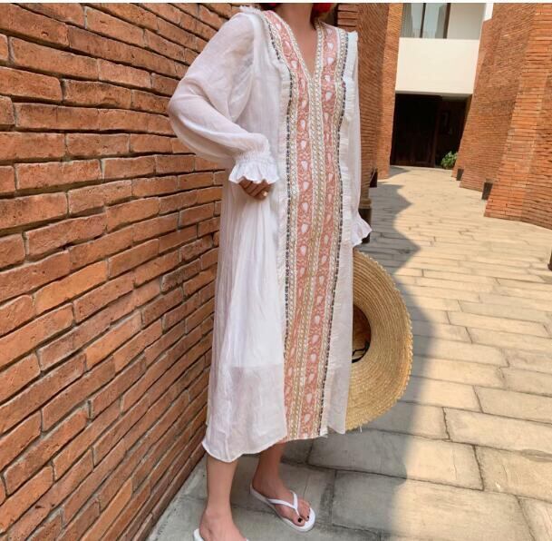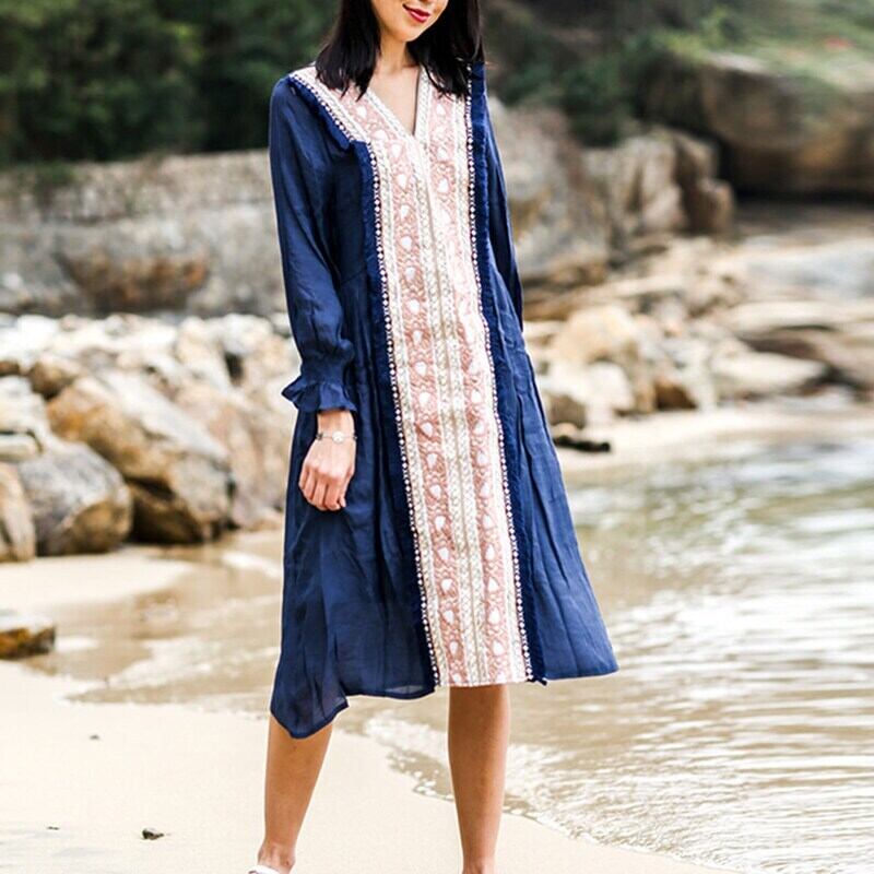 ベラ哲学女性エスニックスプライシング電話ミディドレス刺繍フラワー V ネック自由奔放に生きるドレスバタフライスリーブホリデービーチドレス Vネック フラワーデザイン bel63034316986 | aliel