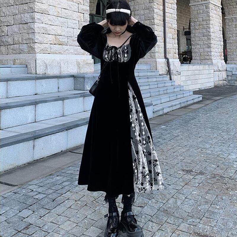 フランスのレトロな黒ミディドレス女性ワンピースドレス 2022 春スリムレースイブニングパーティーベルベットドレスかわいい ブラック 大人ガーリー スウィート キュート カジュアル スプリング 春物 bel85078093477 | aliel