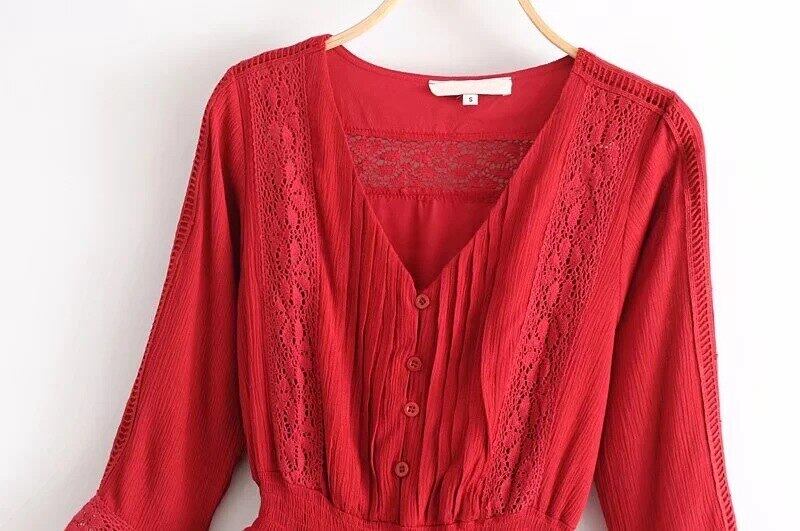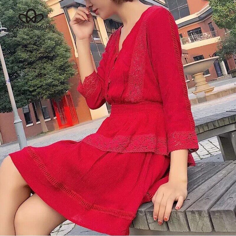 ベラ哲学 2018 春の女性ルーズリストドレスパッチワークレース膝上ドレス女性ハイウエスト V ネックコットンミニドレス ハイウェスト スプリング 春物 Vネック bel29964888520 | aliel