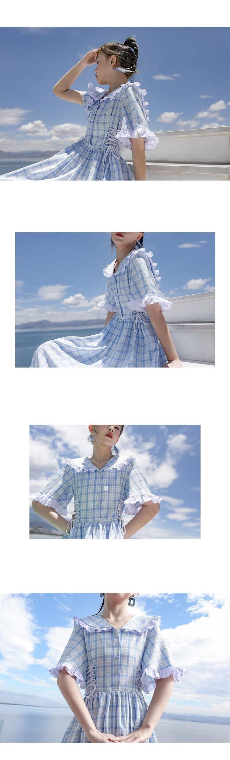 夏スウィートブルーチェック柄ドレス女性弓フレアスリーブ包帯ドレス ese かわいいセーラーカラーロングドレス レッド リボン 大人ガーリー キュート カジュアル サマー 夏物 bel95059082614 | aliel