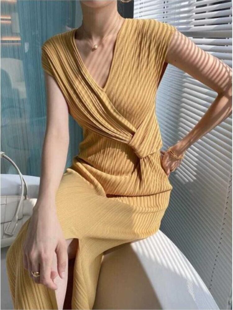 2022 夏エレガントな新フレンチアイスシルクプリーツ編みロングマキシドレスワークオフィス V ネックウエストドレスサイドスプリット サマー 夏物 Vネック 会社 学校 通勤や通学にも bel68495432972 | aliel
