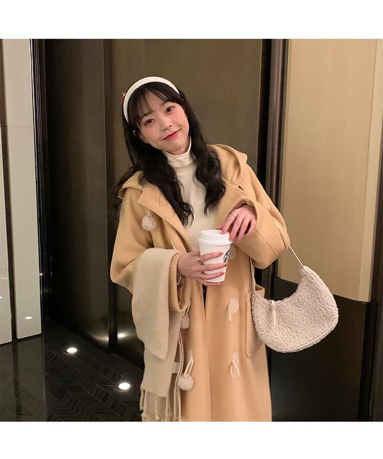 2022 女性ソリッドホーンボタンロングウールコートフード付き甘いオーバーコート女性の冬プレッピースタイル Outerwears 大人ガーリー スウィート キュート カジュアル ウィンター 冬物 ソリッドカラー bel19341201560 | aliel