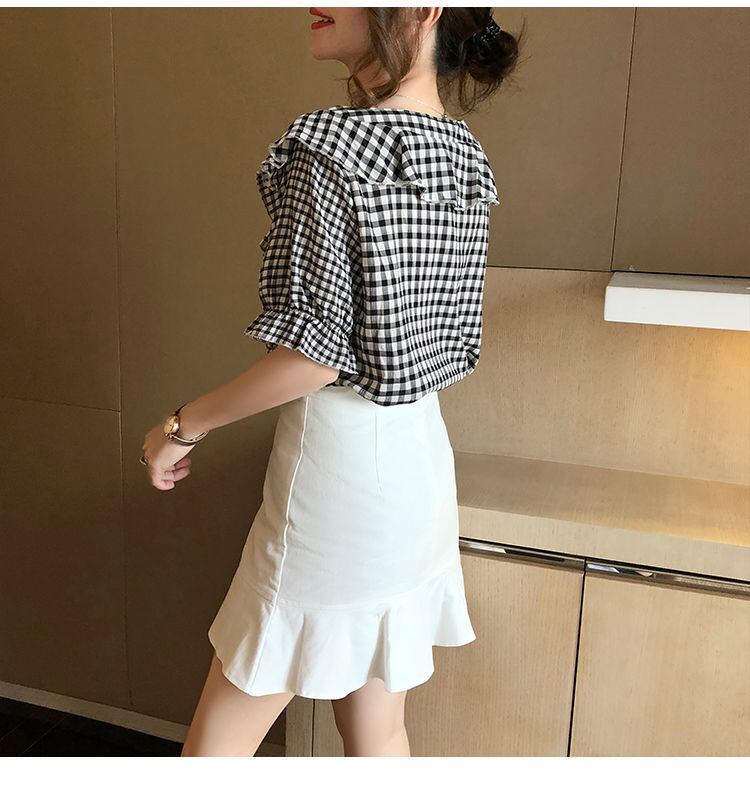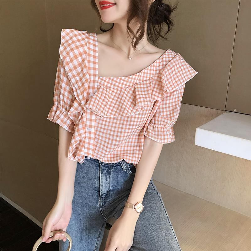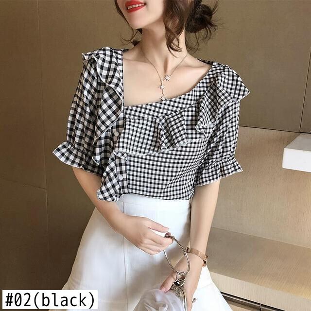 女性の夏の半袖ブラウスシャツチェック柄フリルスウィートブラウスストリートレディショートトップス ハーフスリーブ ラッフル 大人ガーリー キュート カジュアル サマー 夏物 bel66367379537 | aliel