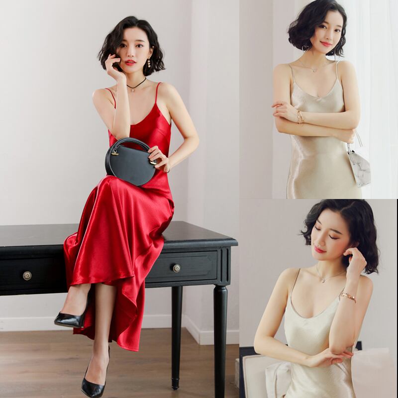 ベラ哲学 2020 女性サテンキャミソールロングドレス女性フェイクシルクスパゲッティストラップ薄いドレス女性の V ネック vestidos ファー Vネック bel60521213682 | aliel