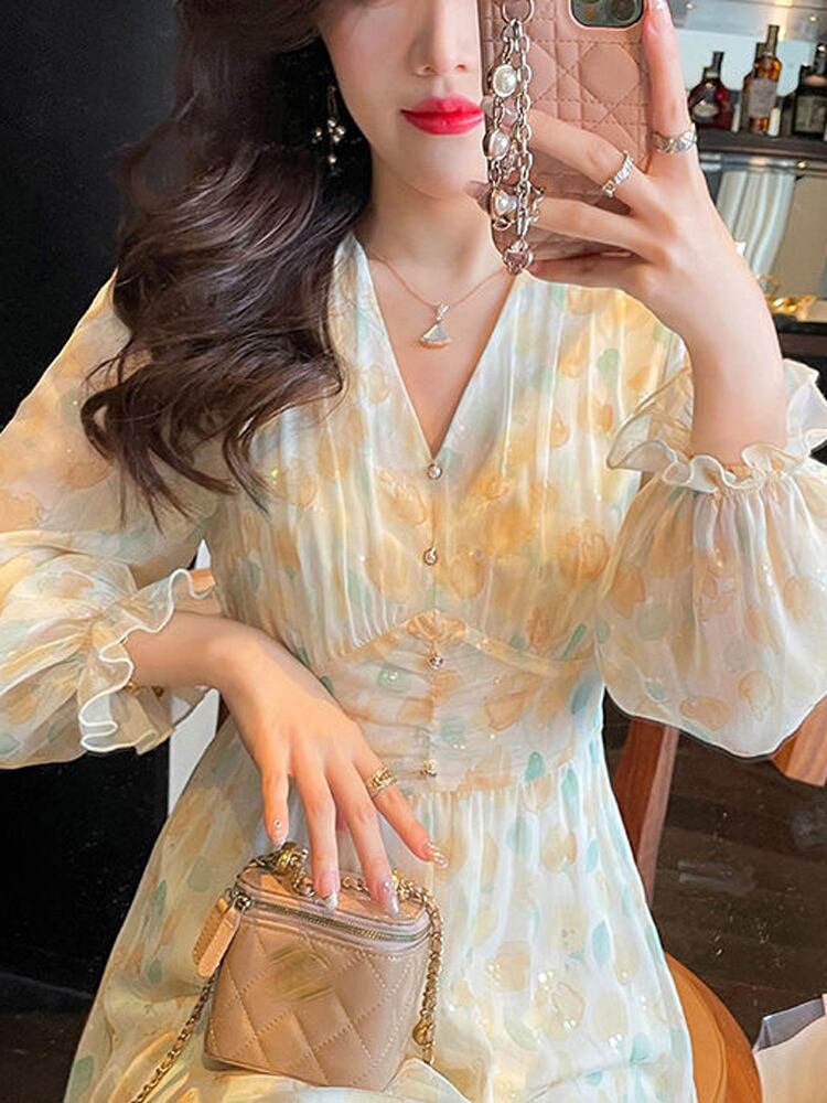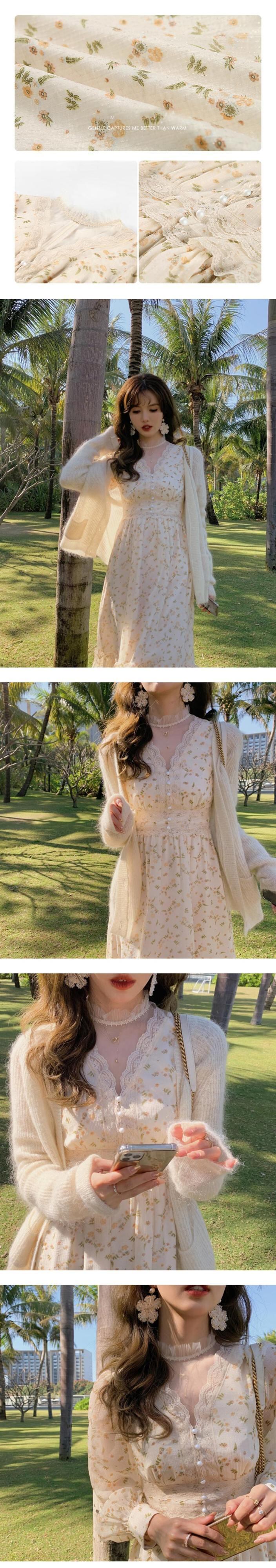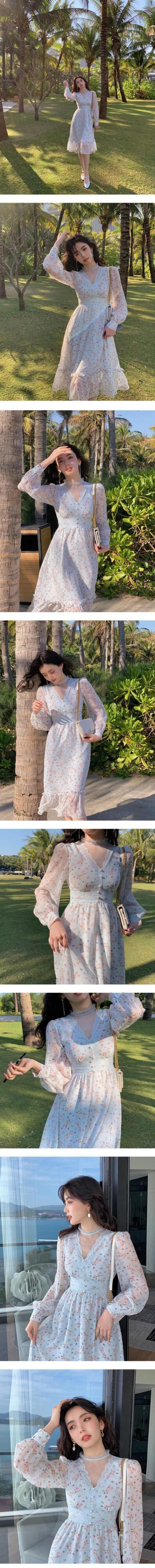 春花フレンチドレス女性レースパッチワーク妖精ドレスセクシーな V ネックプリントパーティードレス スプリング 春物 花柄 bel57300169121