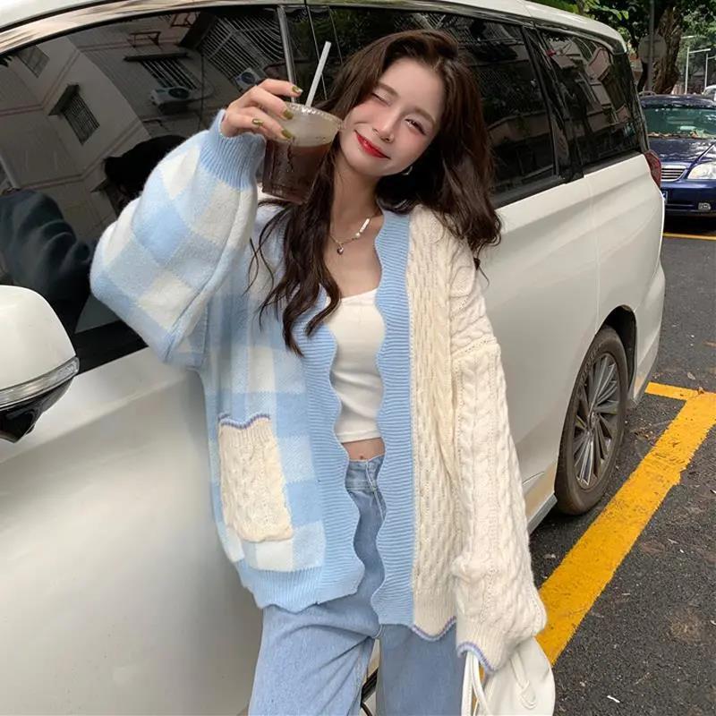 レディース秋ルーズフィットニットパープルカーディガンセーター長袖 V ネックオフィスレディアーガイルチェック柄トレーナートップ ロング オータム 秋物 Vネック 会社 学校 通勤や通学にも bel56965185140 | aliel