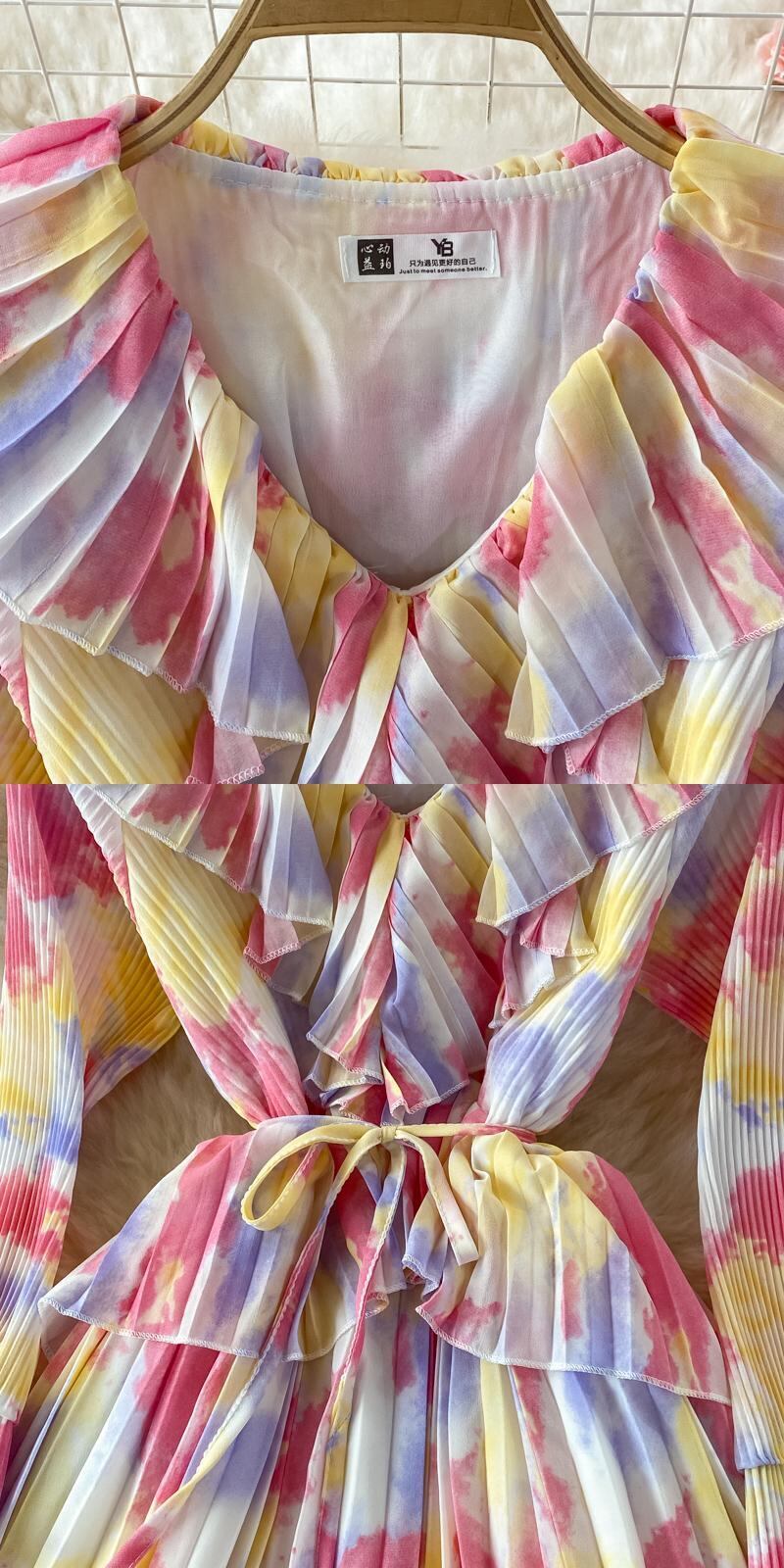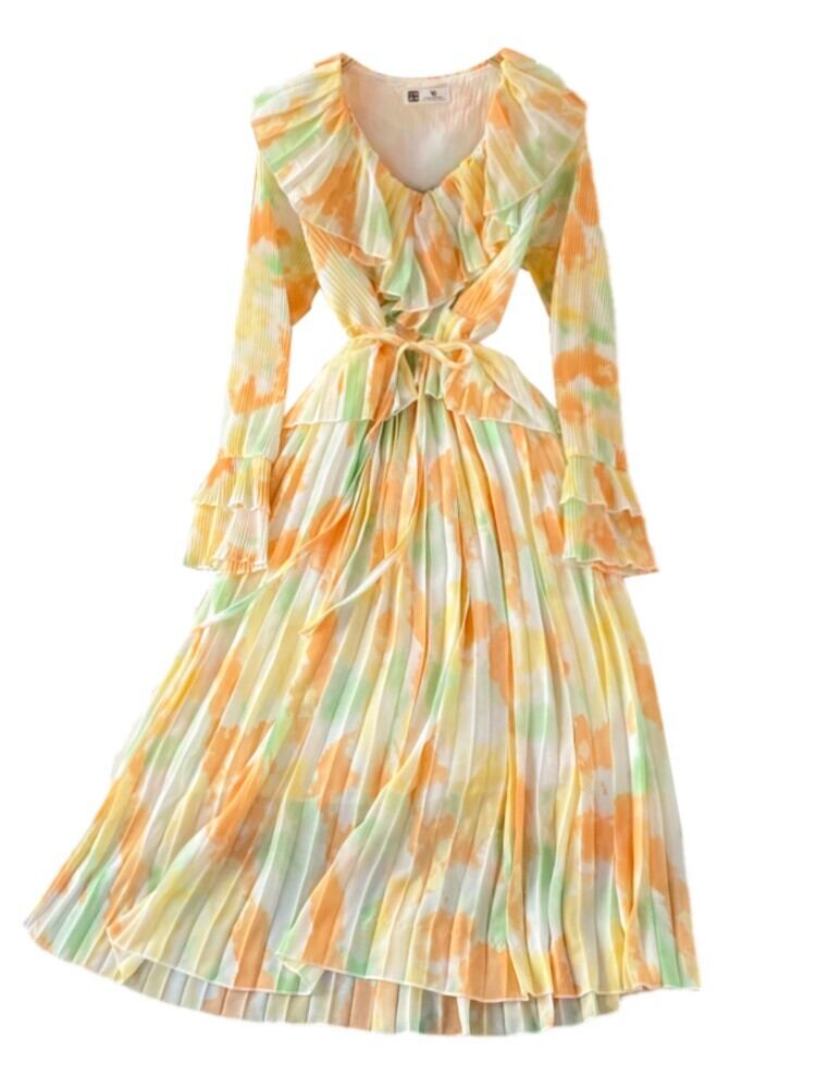 2022 秋の新女性 V ネック長袖フリル絞り染めシフォン A ラインドレス女性のシックなエレガントなウエストプリーツパーティードレス ロング ラッフル オータム 秋物 Vネック Aライン bel15178896815 | aliel
