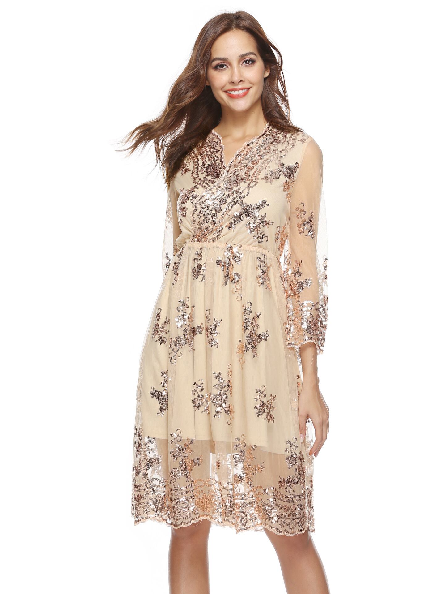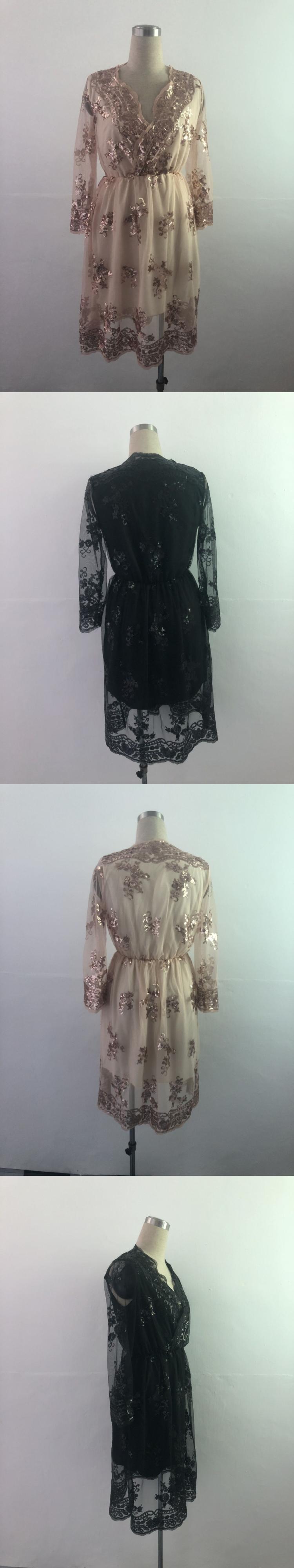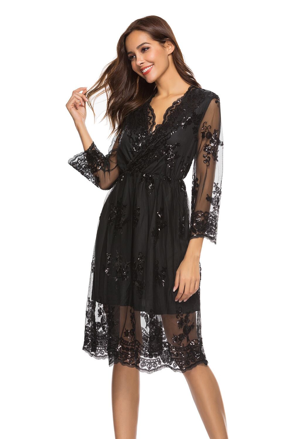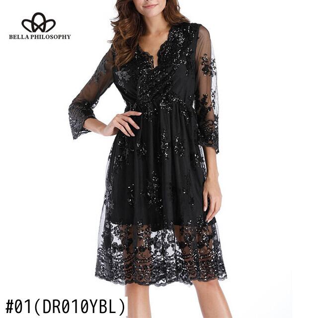 ベラ哲学スパンコール V ネックの女性のドレス七分袖 A ラインのレースのシャツドレスセクシーなイブニングパーティー Vestidos Vネック Aライン bel19978181775