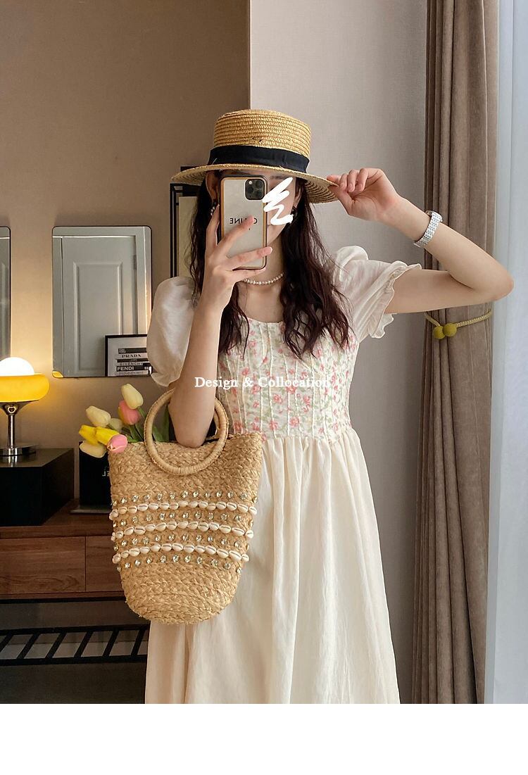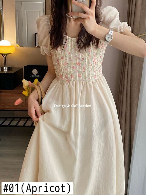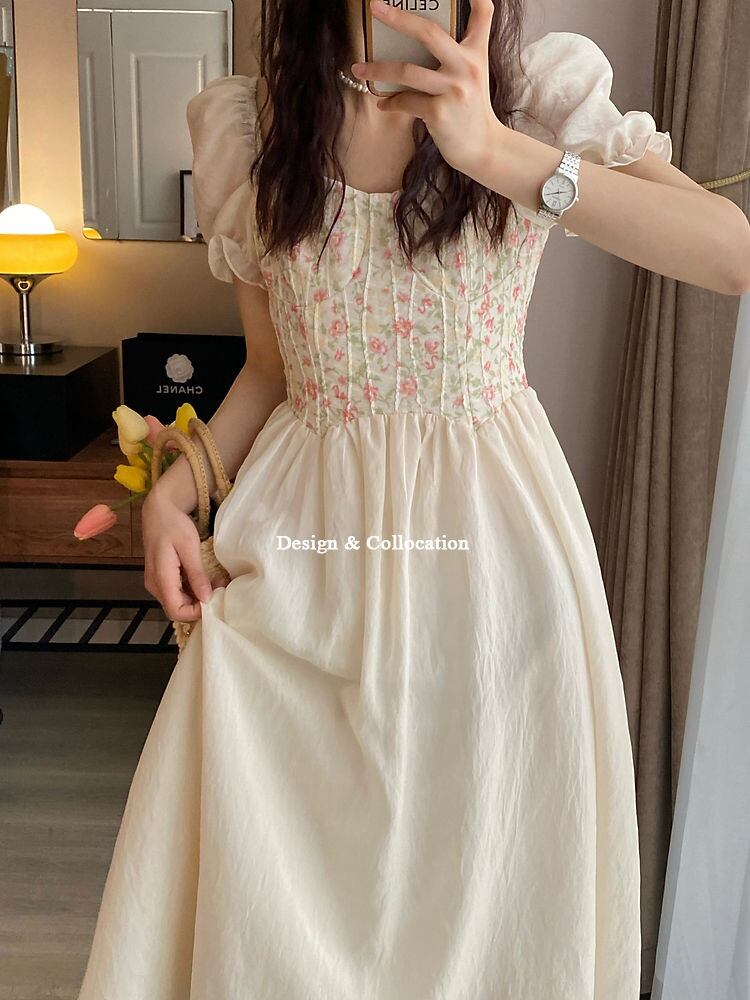 アプリコット花柄パフ スリーブ ドレス女性の夏のレトロなセンセーション ニッチ気質甘い弾性ガール ドレス エラスティック 伸縮 大人ガーリー スウィート キュート カジュアル サマー 夏物 bel28330188581 | aliel