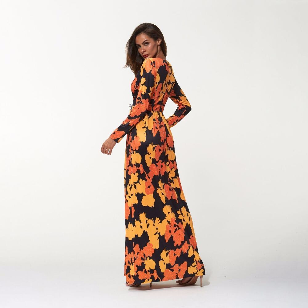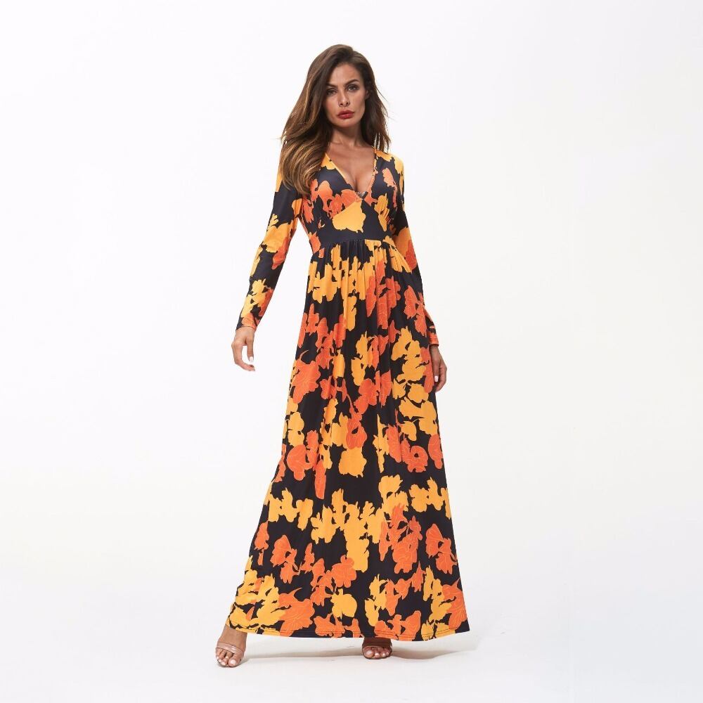 Bella Philosophy 2018 春の女性のドレスフィットとフレアプリント服フルスリーブプリント足首までの長さの V ネックドレス スプリング 春物 Vネック bel47866543153 | aliel