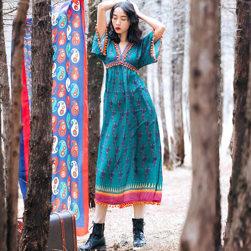 ベラ哲学夏の女性のドレスミディプリント自由奔放に生きるドレス V ネック半袖花嫁介添人ビーチグリーンミッドカーフインディーフォーク Vestidos ハーフスリーブ サマー 夏物 Vネック bel33637185939 | aliel