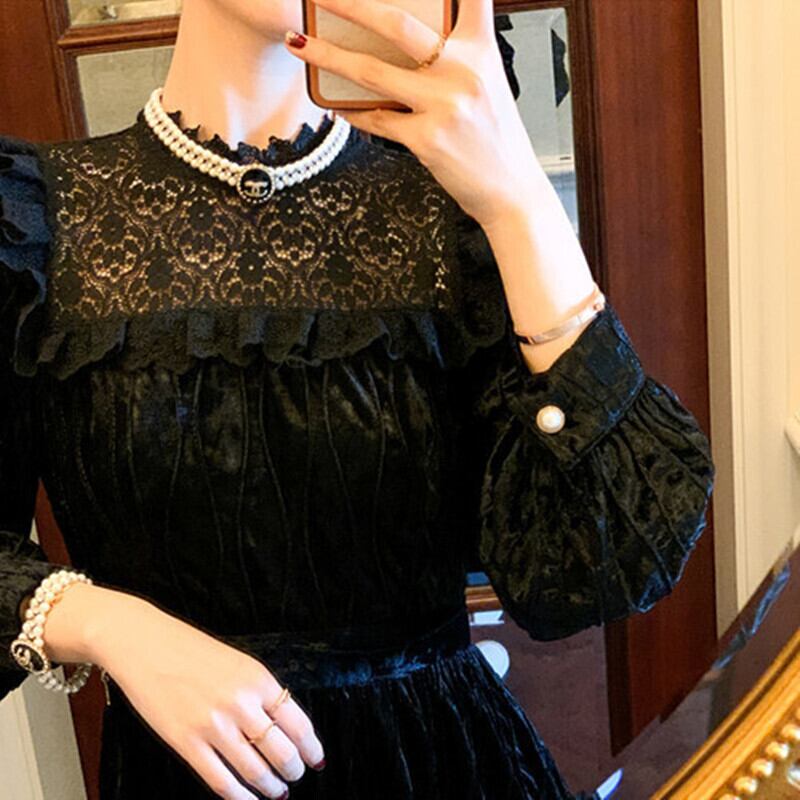 2021 秋と冬の新プリンセススタンドアップカラーレースステッチ長袖ベルベットドレス платье vestido mujer túnicas mujer ロング オータム 秋物 ウィンター 冬物 bel64073051330 | aliel