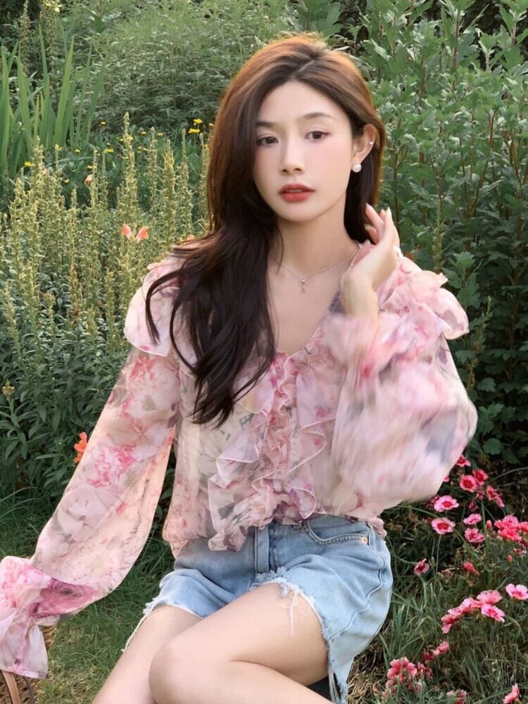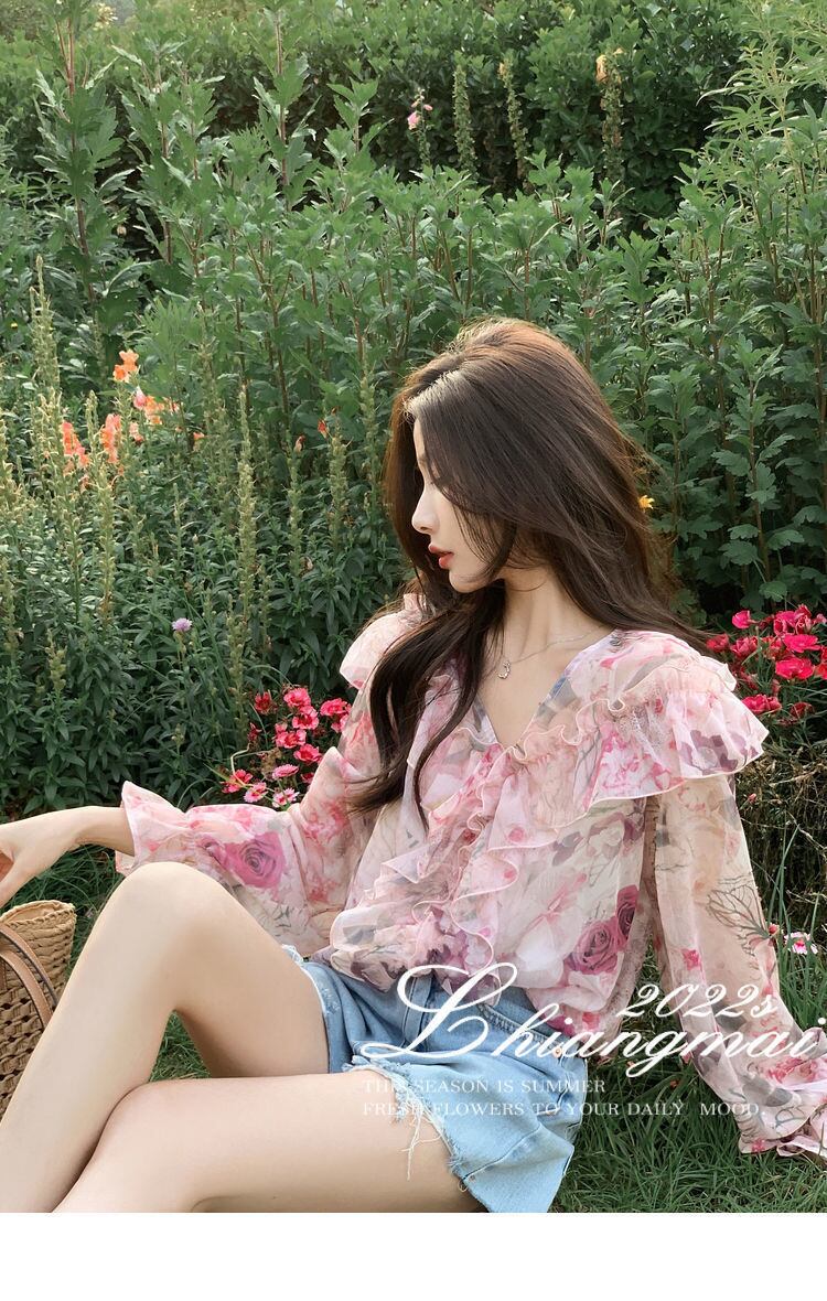 2022 レディース プリント フレア スリーブ V ネック ブラウス スウィート シフォン トップス フレアスリーブ 大人ガーリー キュート カジュアル Vネック bel44757901440 | aliel