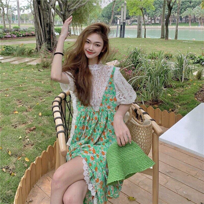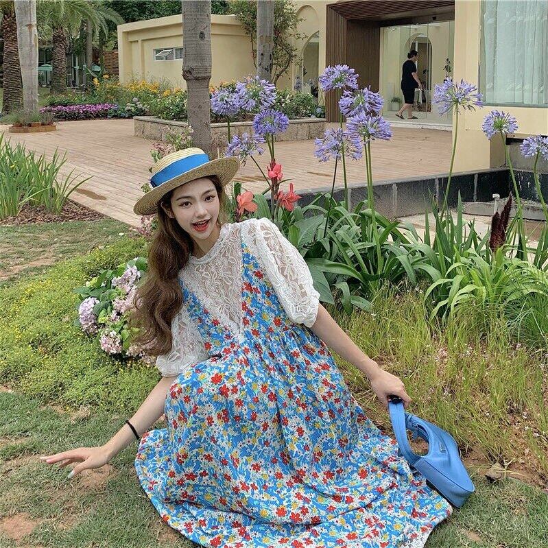 甘いレースにスプライシング花 Derss スーツ女性の夏 2021 ディープ V ネックルーズノースリーブドレス + レースブラウス 2 枚セット 大人ガーリー スウィート キュート カジュアル サマー 夏物 花柄 Vネック bel22203062055 | aliel