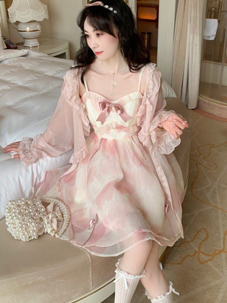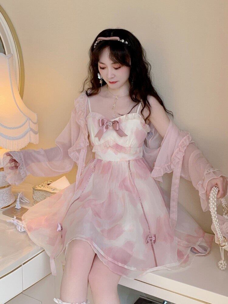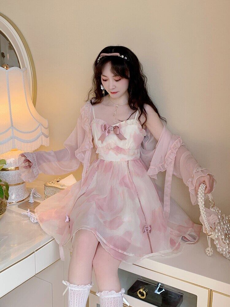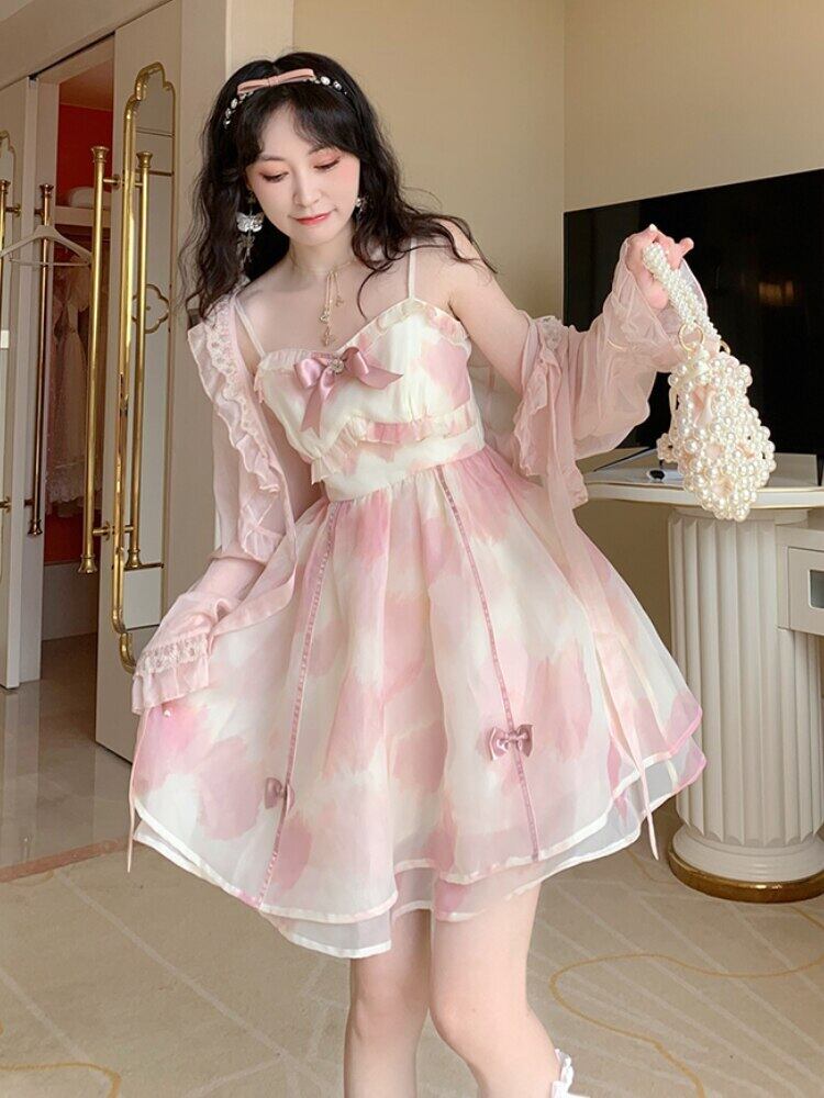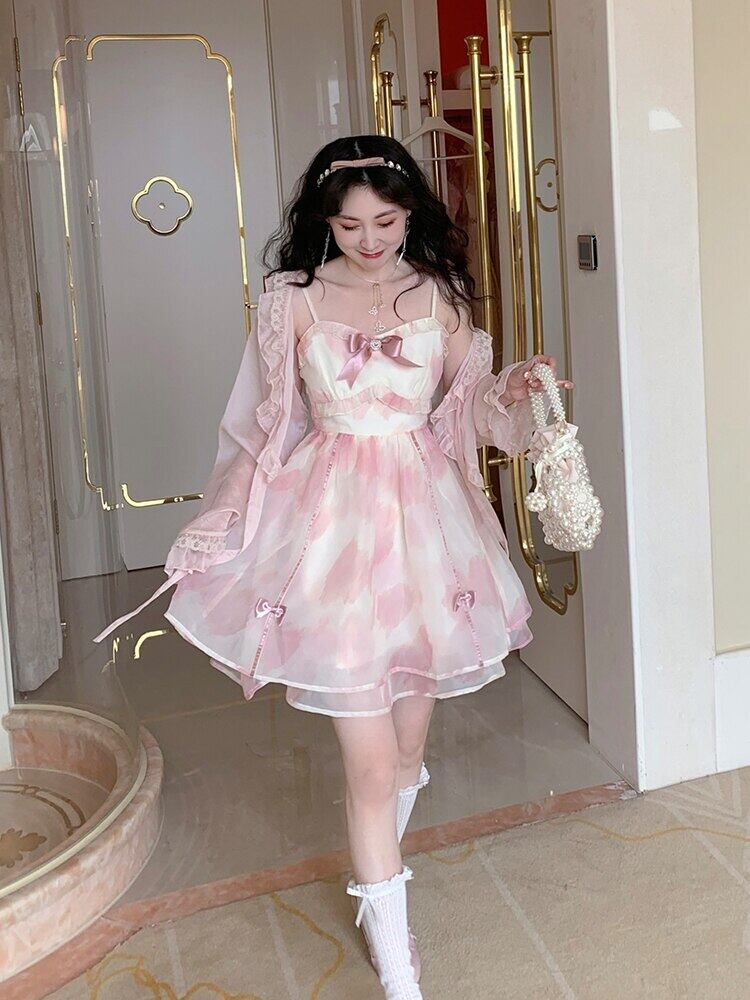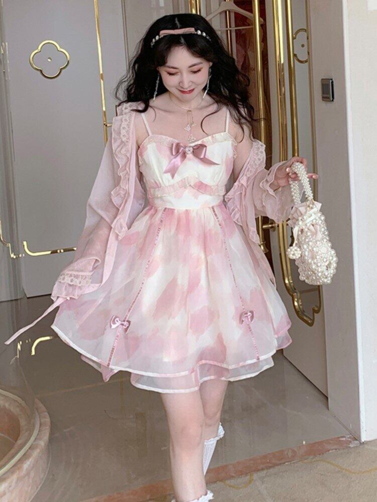 夏ピンクストラップドレス女性弓甘いパーティーミニドレスプリントフランス妖精ドレス 2022 リボン 大人ガーリー スウィート キュート カジュアル サマー 夏物 bel9908565495 | aliel