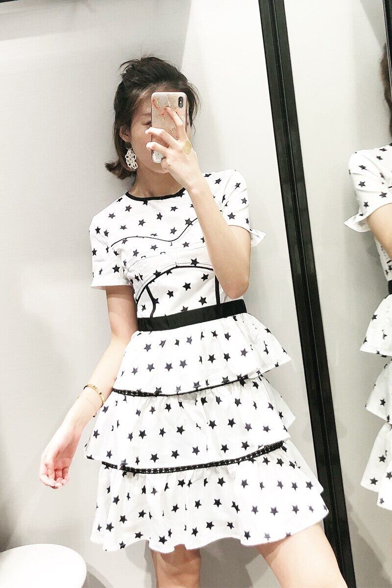 Bella Philosophy サマードレス ホワイト レトロ スター プリント ラウンドネック 半袖 ハイウエスト ケーキ フリル レイヤードレス ハイウェスト ラッフル 夏物 Oネック bel71830634141 | aliel