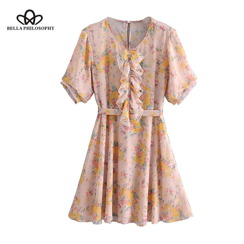 Bella Philosophy 夏の女性のフラワー プリント ドレス ベルト付きミニ ドレス Vestidos フリル v ネック レースアップ レディース ドレス ラッフル サマー 夏物 ハーネス Vネック フラワーデザイン bel8154439035 | aliel