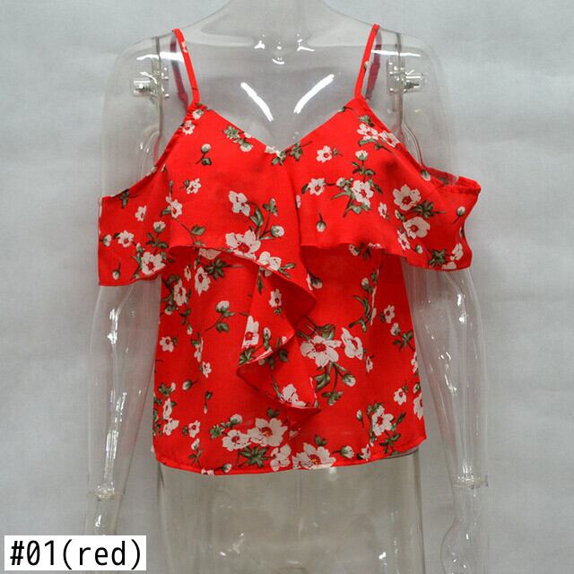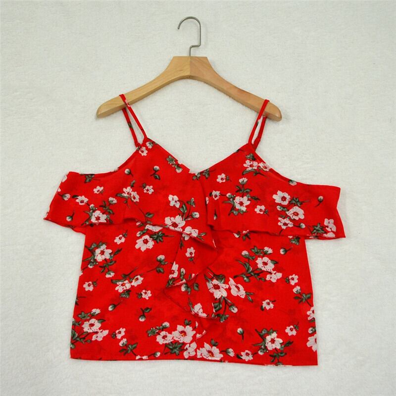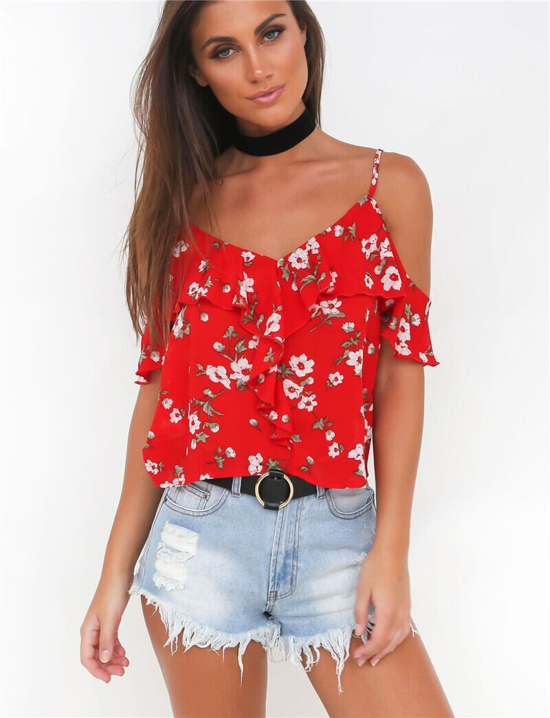 Bella Philosophy 2019 夏セクシーな赤いスパゲッティ ストラップ花柄ブラウス v ネック フリル ショート blusas バックレス カジュアル シャツ レッド ラッフル サマー 夏物 Vネック bel32108980837 | aliel