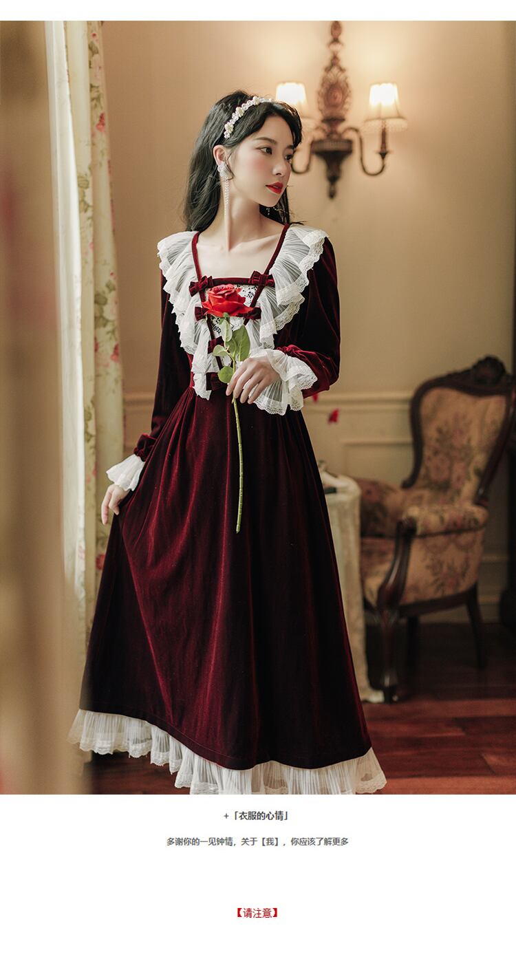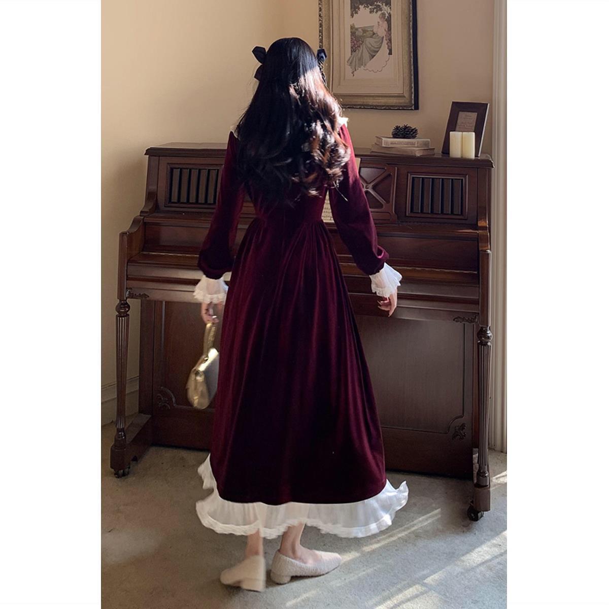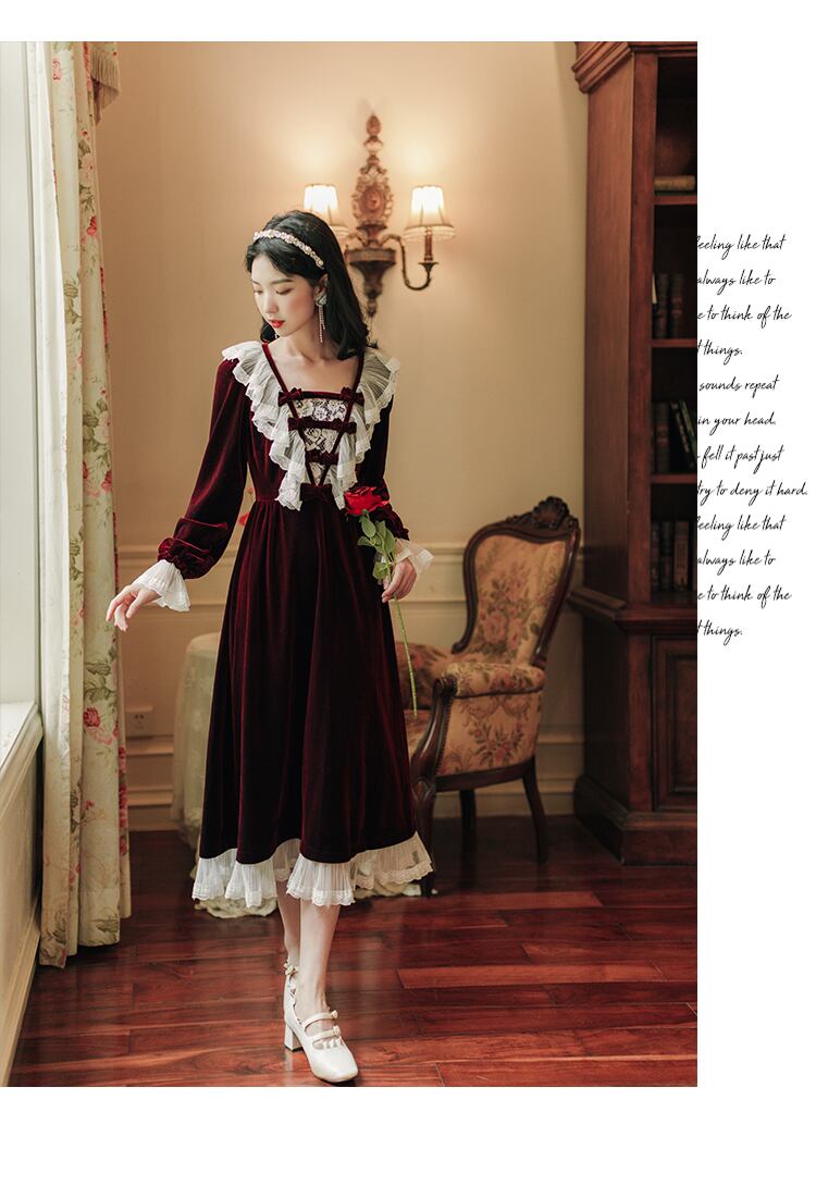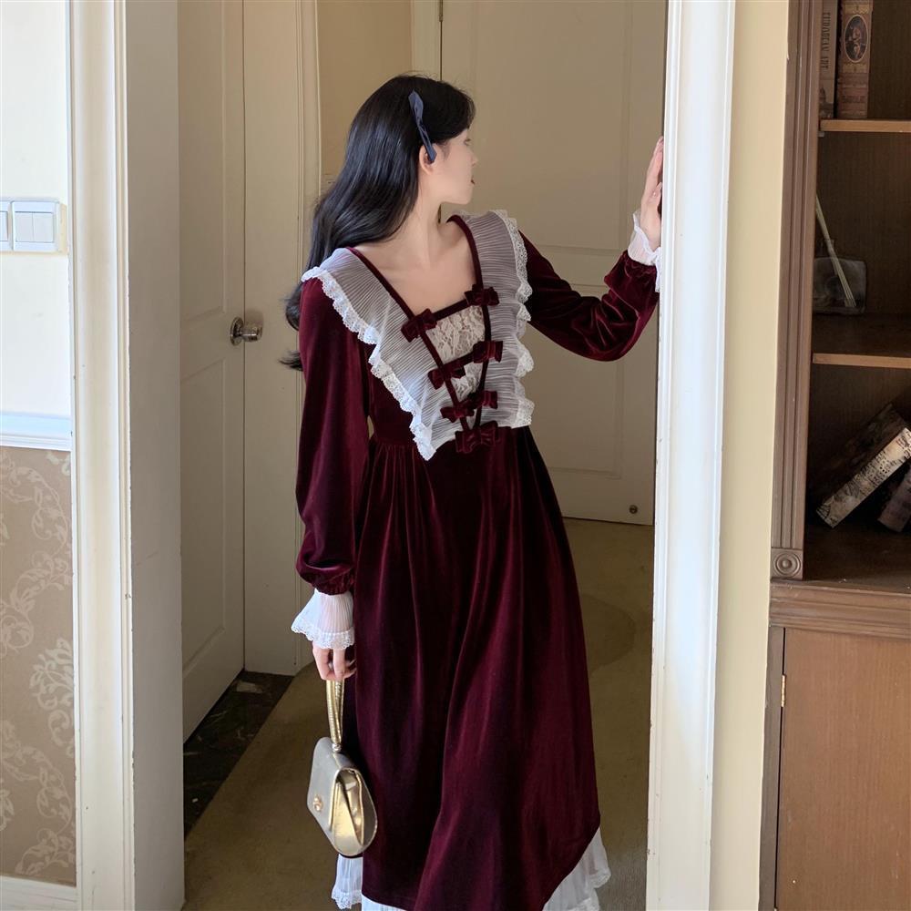 春秋赤ワインベルベットパッチワークメッシュ V ネックミッドカーフレース長袖イブニングパーティーロング女性 Vestidos レッド スプリング 春物 Vネック bel75748613898 | aliel