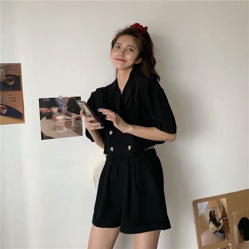 女性の夏のツーピースセットダブルブレストショートブレザースーツオフィスレディブレザー & ショーツセット サマー 夏物 ブルマー 会社 学校 通勤や通学にも bel50376798810 | aliel