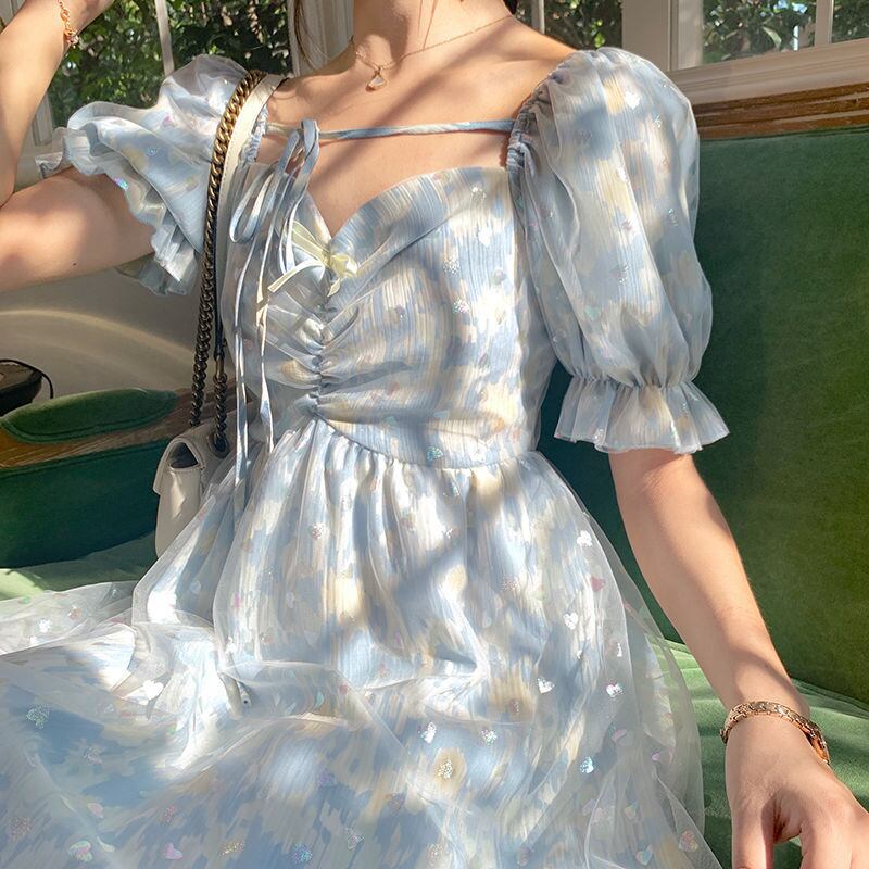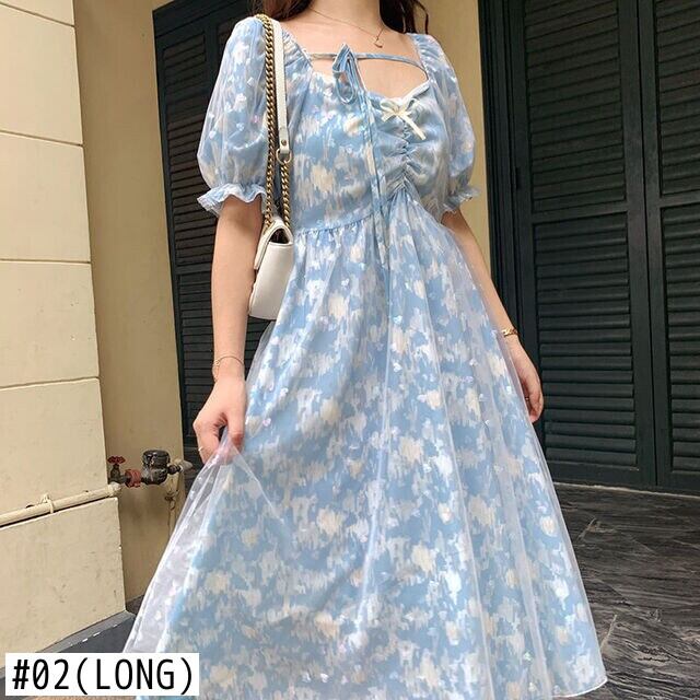 フレンチスウィートドレス女性半袖レースアップドレス花パーティー妖精ドレス 2021 夏セクシーな ショート ハーフスリーブ 大人ガーリー キュート カジュアル サマー 夏物 花柄 bel46994085672 | aliel