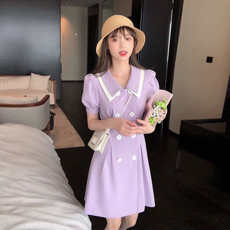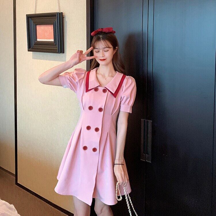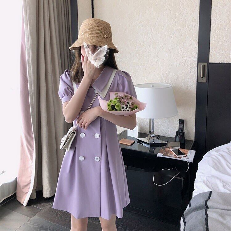 夏のAラインドレスダブルレイヤーカラースウィートパフスリーブドレスダブルブレストソリッドスリムドレスVestidos 大人ガーリー キュート カジュアル サマー 夏物 ソリッドカラー bel27750374980 | aliel