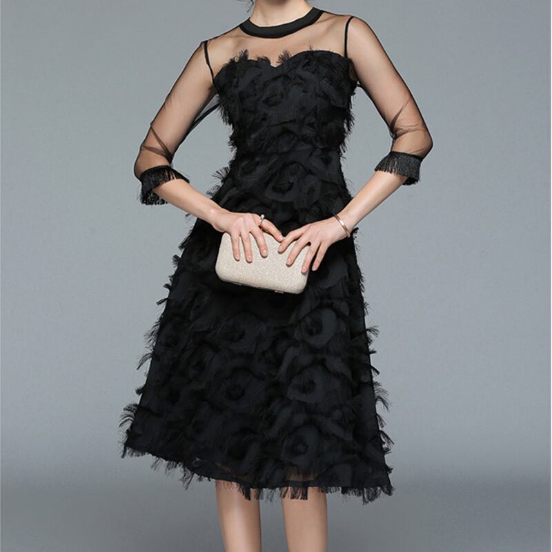 ベラ哲学春 O ネック A ライン無地女性ドレス膝丈ハーフスリーブ黒ドレスセクシーなイブニング女性ドレス ブラック 半袖 スプリング 春物 Oネック Aライン ソリッドカラー bel84010792236