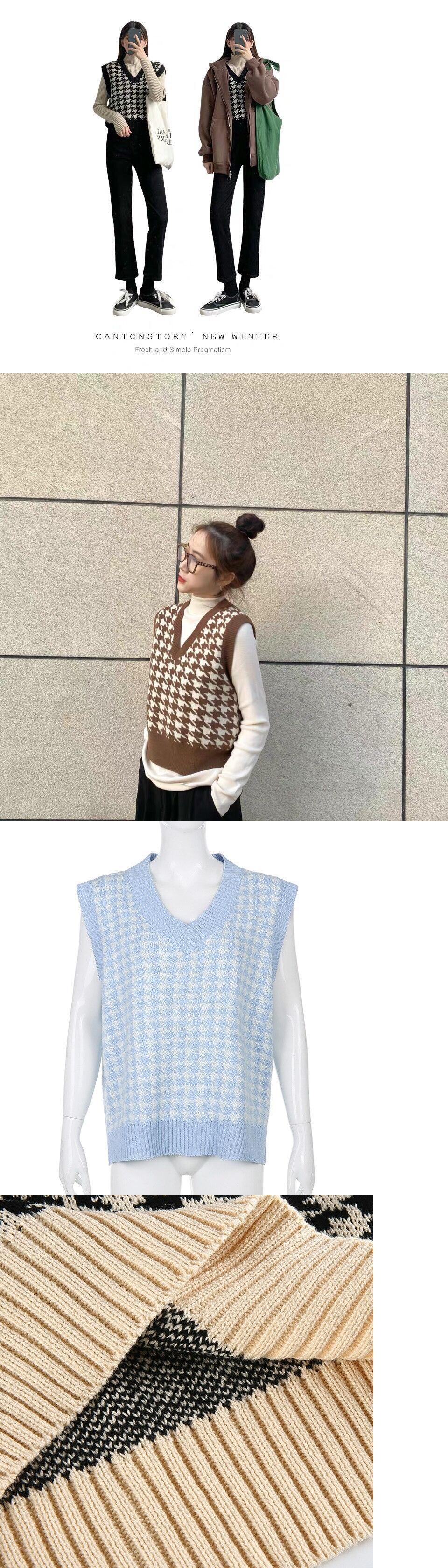 特大の女性ニット ベスト セーター千鳥格子緩い V ネック ノースリーブ プル トップス チョッキ春ベスト スプリング 春物 Vネック bel88147281902