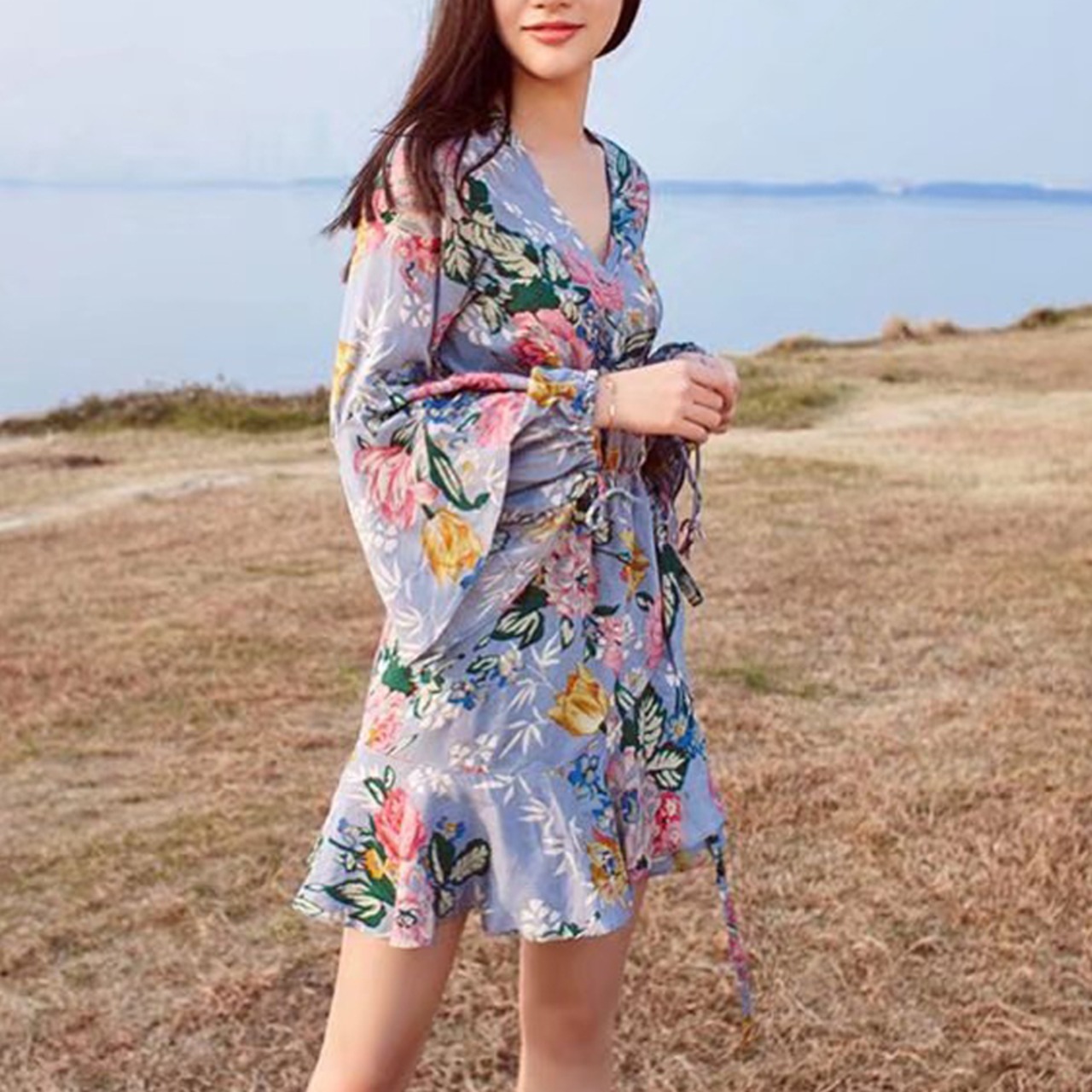 ベラ哲学 2018 春の女性ロングバタフライスリーブドレスプリント V ネックルース女性ミニドレスコットンサッシフリルドレス ラッフル スプリング 春物 Vネック bel65463595324 | aliel