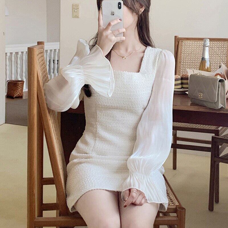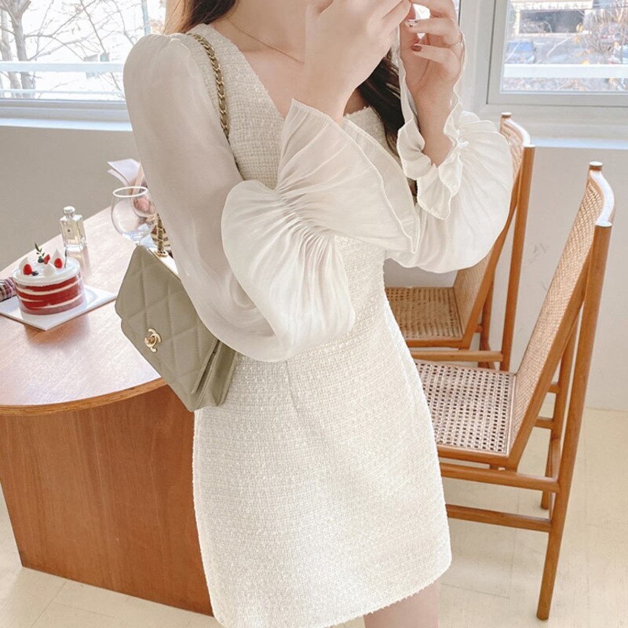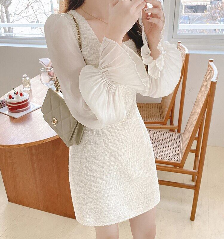 秋冬フレンチパッチワークツイードミニドレス女性長袖パーティードレス OL ローブ Fairycore ローブファム ロング オータム 秋物 ウィンター 冬物 フェミニン bel31277724938 | aliel
