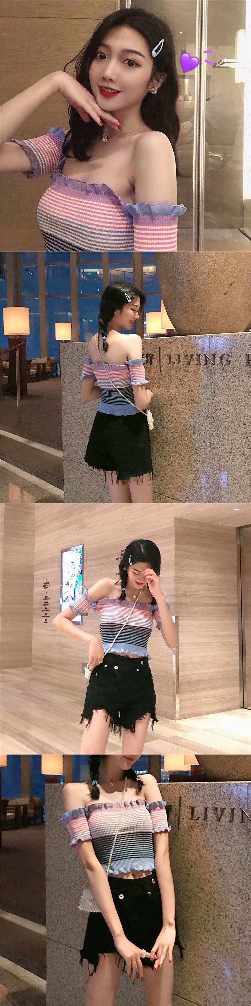 Tシャツ女性の夏のカラフルなストライプオフショルダーショートクロップトップスリム背中の開いたセクシーなレディースニットフリルかわいいオルホット ラッフル 大人ガーリー スウィート キュート カジュアル サマー 夏物 bel77153236311 | aliel