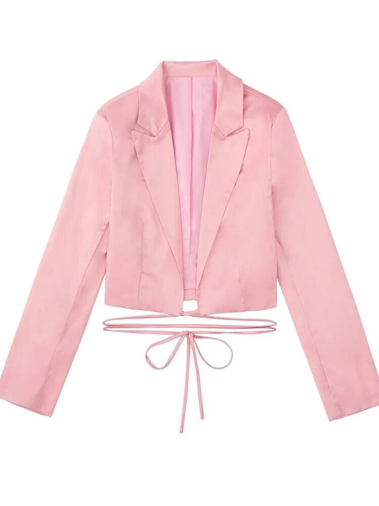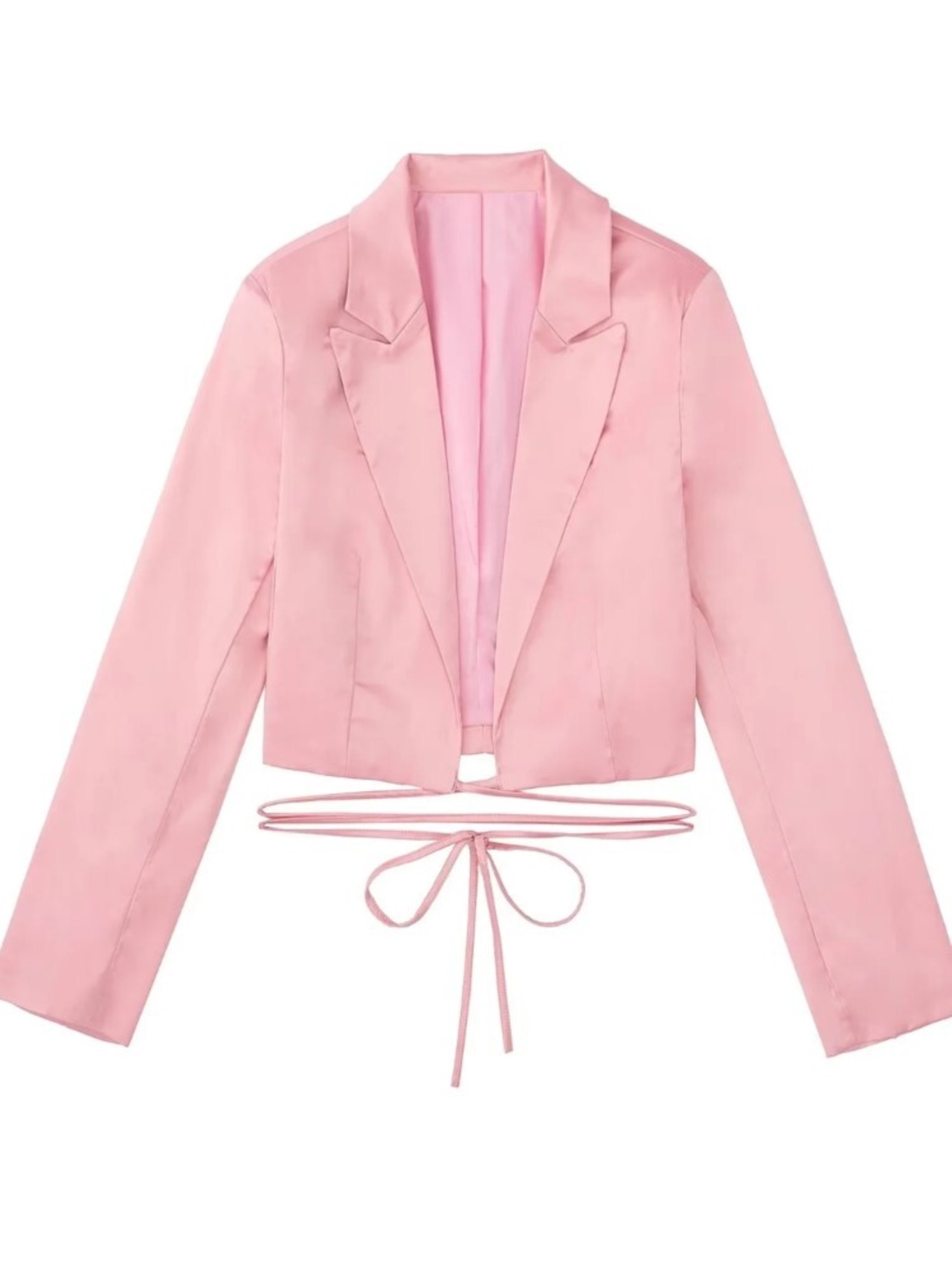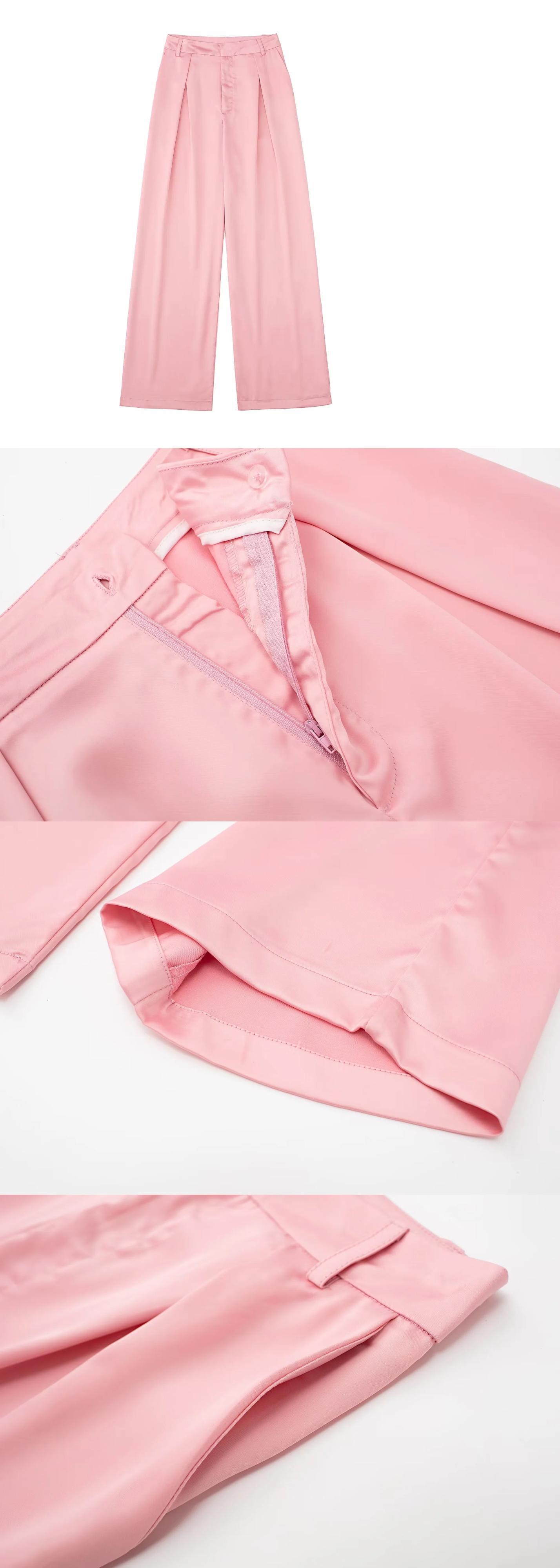 2022 女性の秋のショートブレザーサテン固体二枚セットピンク甘いストレートレッグパンツブレザースーツ 大人ガーリー スウィート キュート カジュアル オータム 秋物 ソリッドカラー bel594683248