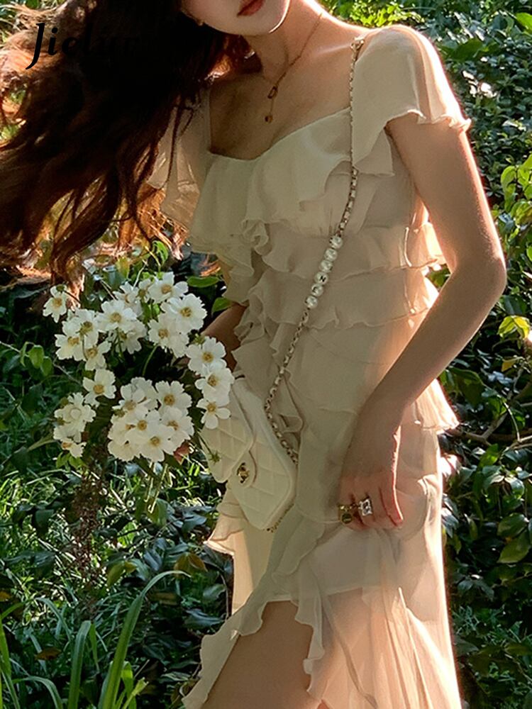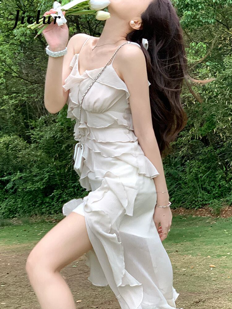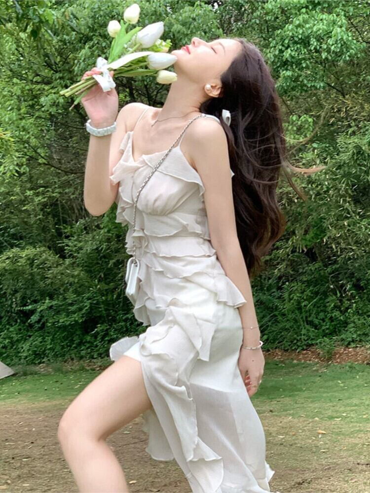 ホワイト シフォン ドレス女性ビーチ自由奔放に生きるミディ ストラップ ドレス フリル イブニング パーティー ノースリーブ花柄ワンピース ドレス 2022 夏 サマー 夏物 bel70946331262 | aliel