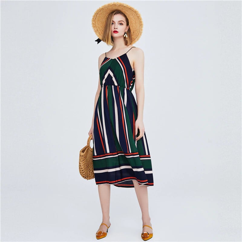 Bella Philosophy ストライプビーチドレス女性のセクシーなノースリーブスパゲッティストラップミディ A ラインドレスサンドレス Vestidos Aライン bel20765822687 | aliel