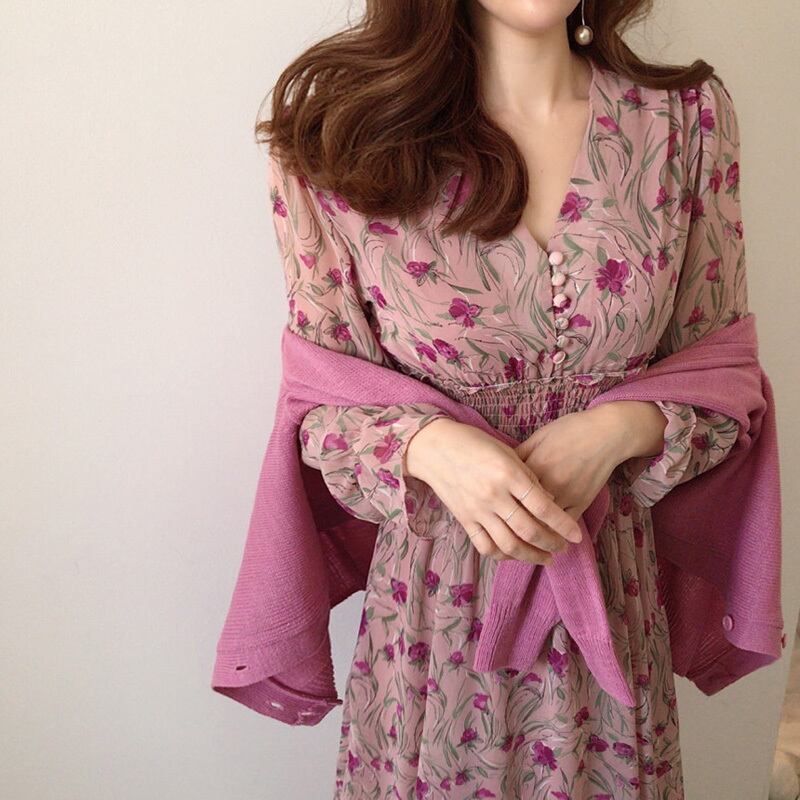 V ネック花柄弾性ウエスト女性ドレス フレア スリーブ フロント ボタン A ライン ロング ドレス フレアスリーブ エラスティック 伸縮 Vネック Aライン bel39285980812 | aliel