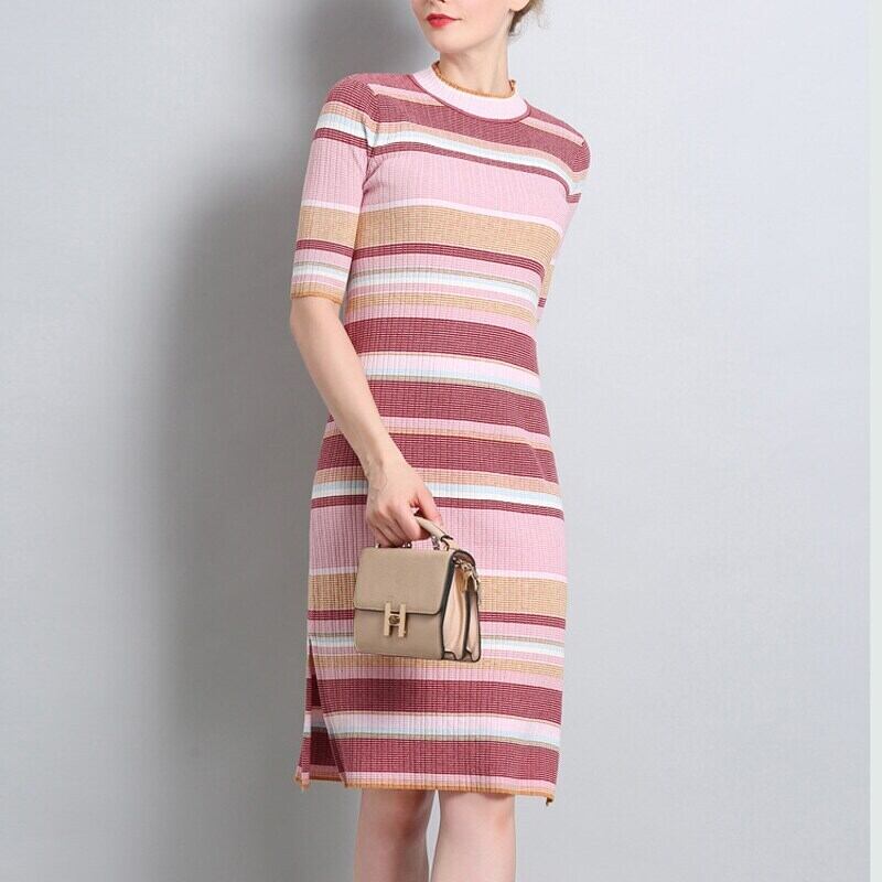 ベラ哲学女性ドームカラーストライプニット半袖ニットドレスレディース秋のドレス女性 O ネックシースドレス ショート ハーフスリーブ オータム 秋物 Oネック bel16866179650 | aliel