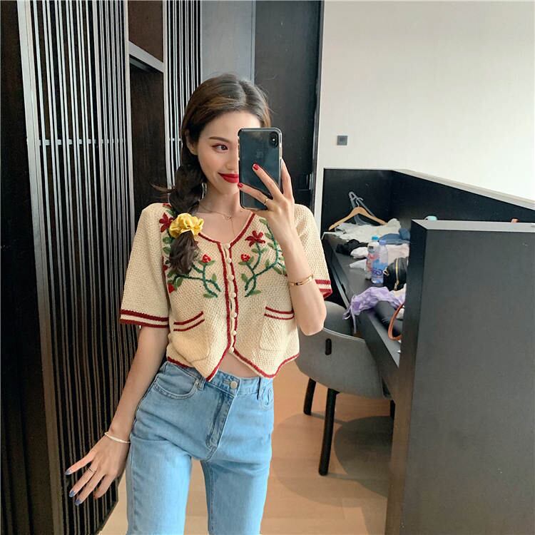 スリムクロップトップ夏刺繍花柄トップス V ネックニットレディースブラウス半袖シャツシックな 2020 トップス ショート ハーフスリーブ サマー 夏物 Vネック bel40933666760 | aliel
