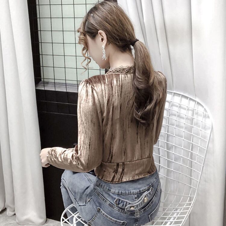女性秋長袖 V ネックシャイニーブラウスシャツレースプルオーバーオフィスレディメタリックトップス ロング オータム 秋物 Vネック 会社 学校 通勤や通学にも bel68613937784 | aliel