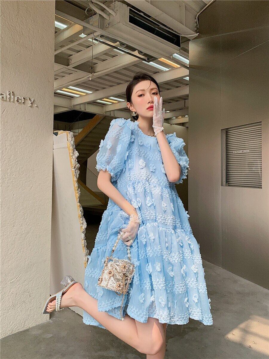 女性の花ショート パフ スリーブ メッシュ ドレス大サイズ ブルー色かわいい ドレス レディ潮夏 2021 大きめサイズ 大人ガーリー スウィート キュート カジュアル サマー 夏物 フラワーデザイン bel29054772911 | aliel