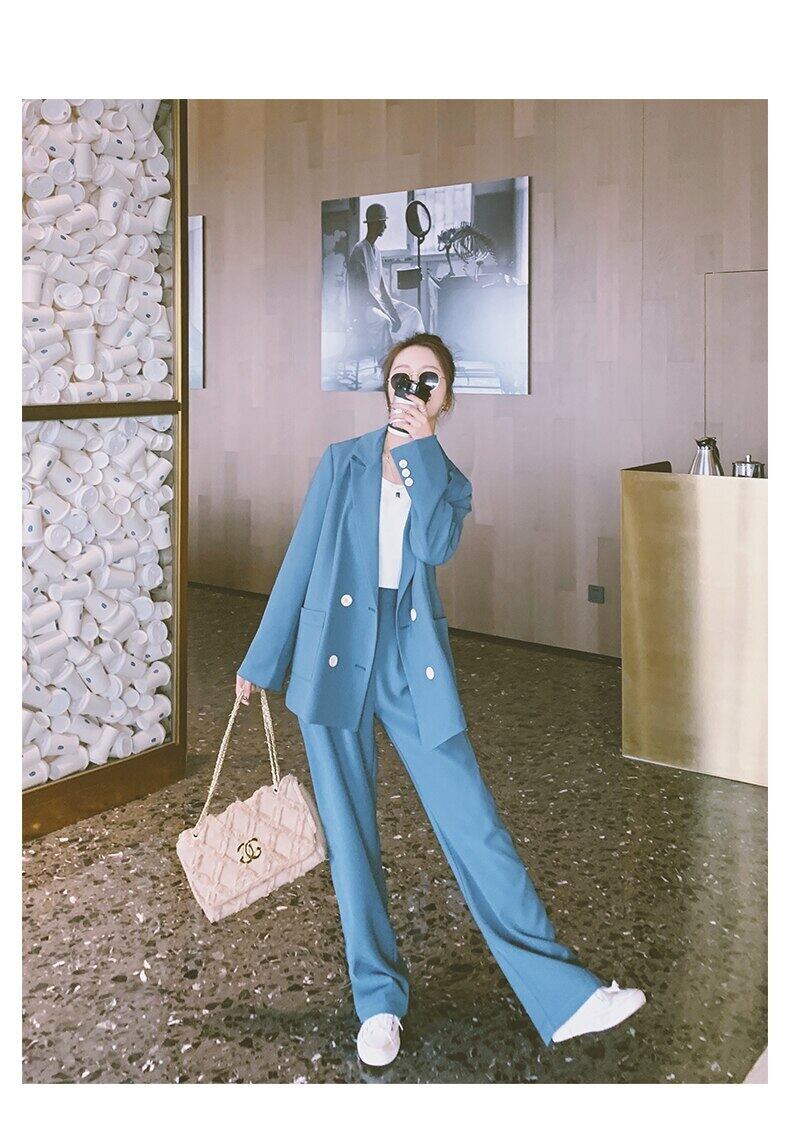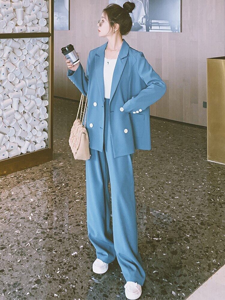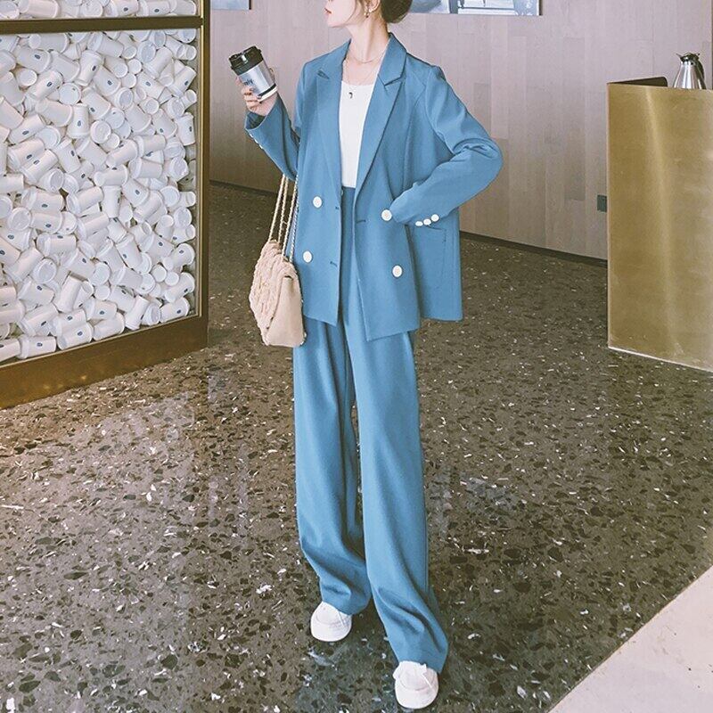 春の女性ブルーブレザースーツダブルブレストブレザージャケットワイドレッグパンツオフィスレディスーツ スプリング 春物 ワイドパンツ 会社 学校 通勤や通学にも bel14769992224 | aliel